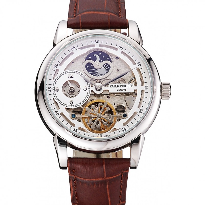 Gama alta Patek Philippe Tourbillon Tiempo doble Fase lunar negro en esqueleto Dial correa de cuero caja de acero inoxidable de Brown