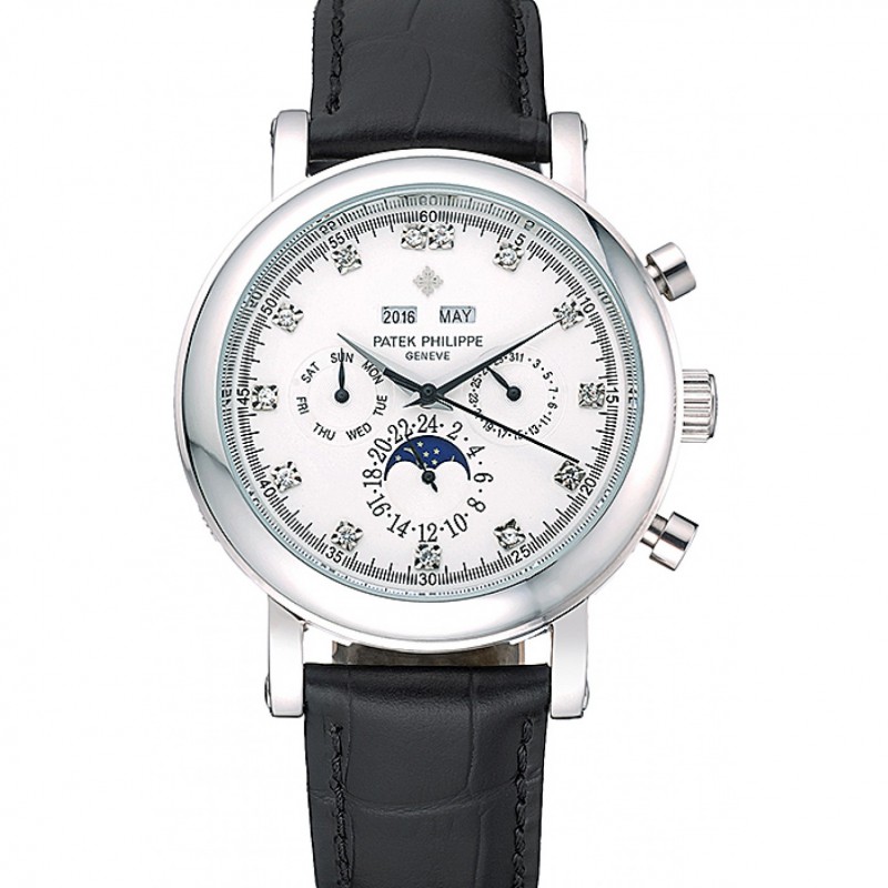 Patek Philippe Grand complicaciones calendario perpetuo esfera blanca pulsera de cuero Negro