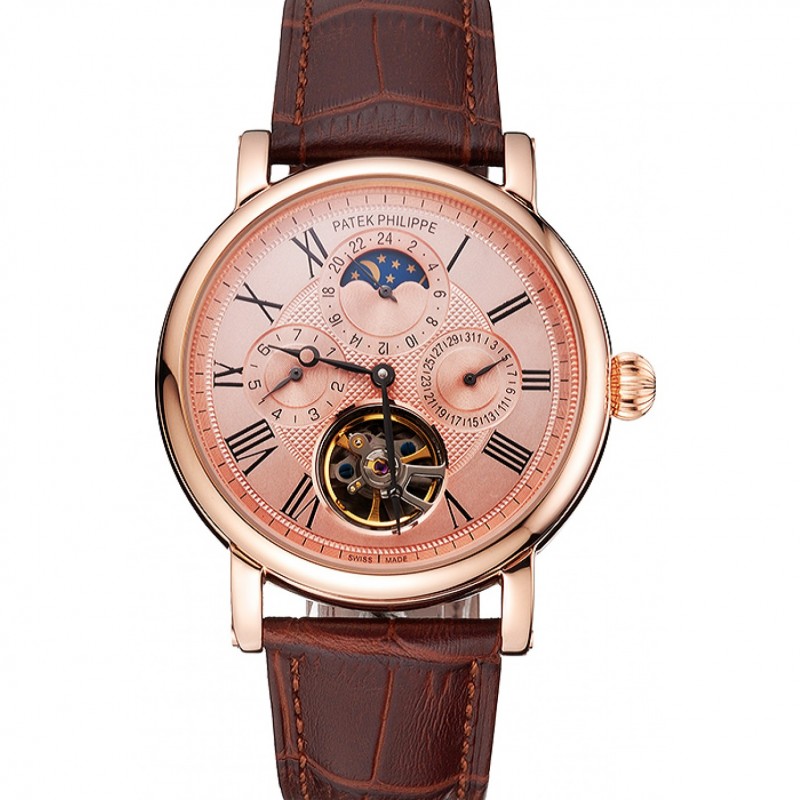 Mejor Réplicas Relojes Patek Philippe Grand complicaciones Fase lunar del calendario perpetuo de oro rosa Dial Tourbillon Y Correa de cuero marrón