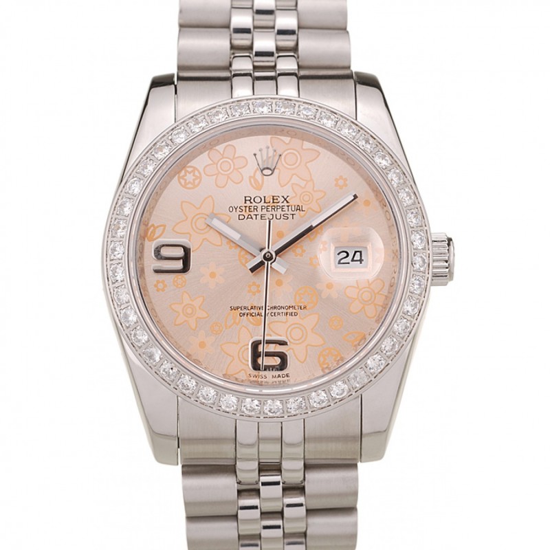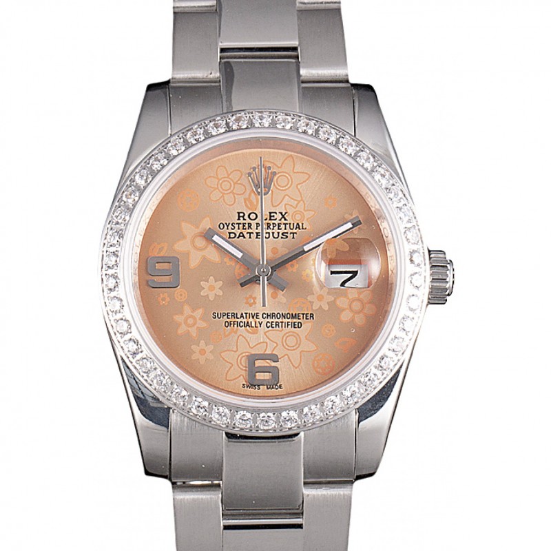 Rolex Datejust acero inoxidable pulido Flores naranjas Dial Diamante plateado