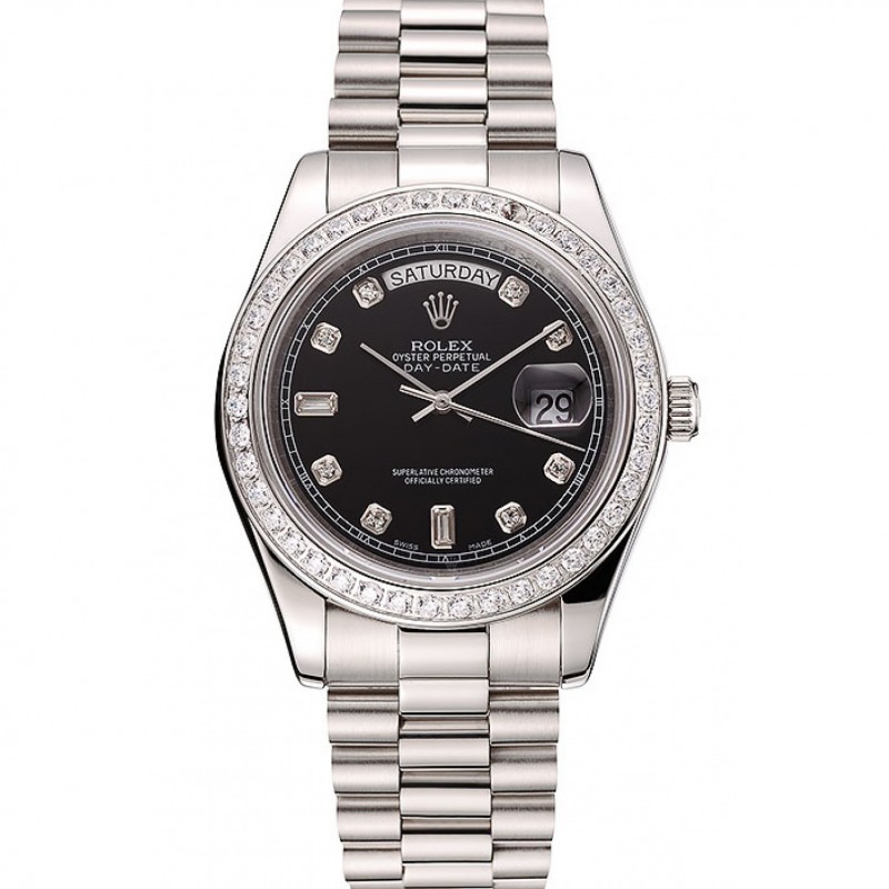 Suiza Rolex Day-Date Negro Dial caja del diamante diamante numerales pulsera de acero inoxidable 1453966