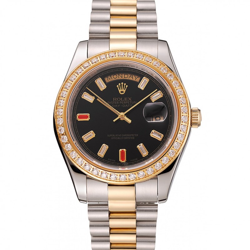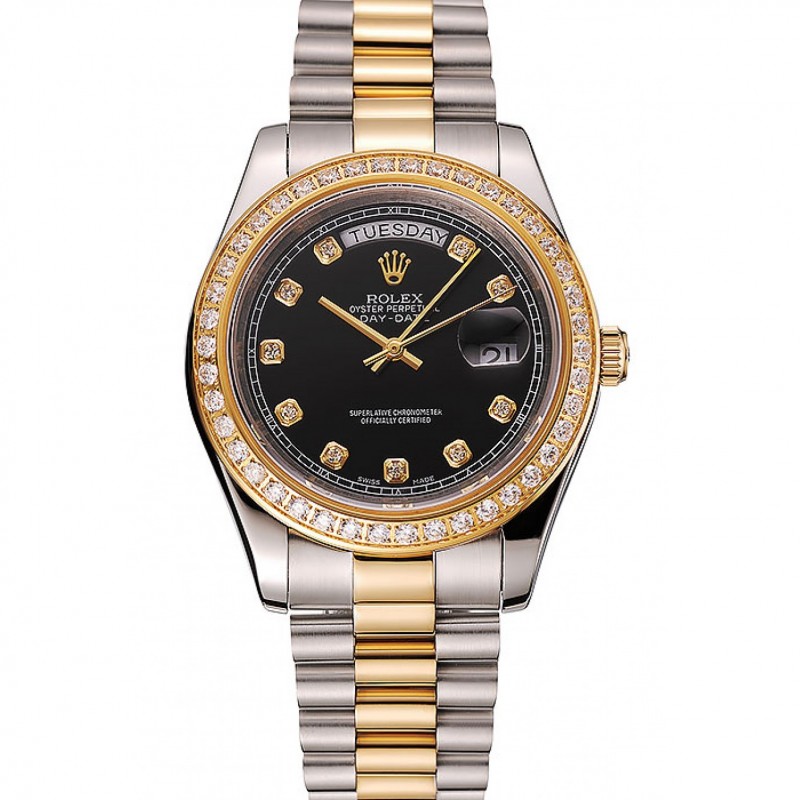 Alta calidad Suiza Rolex Day-Date Negro Dial caja del diamante de oro dos tonos pulsera de acero inoxidable 1453975