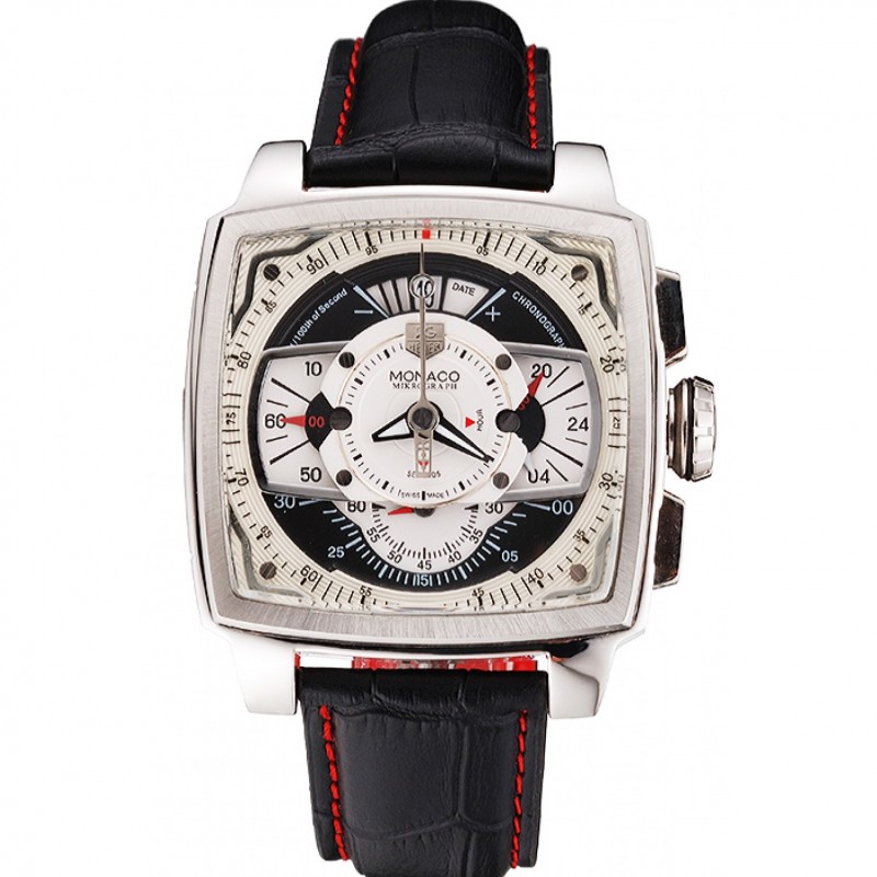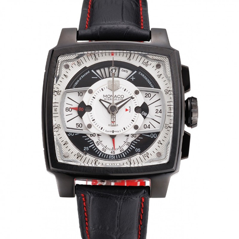 Lujo Réplicas Relojes Tag Heuer Monaco Negro-Rojo de cuero perforado Correa esfera blanca 80307