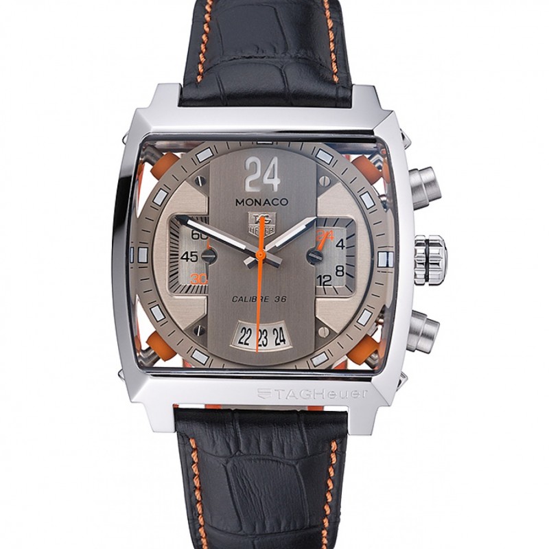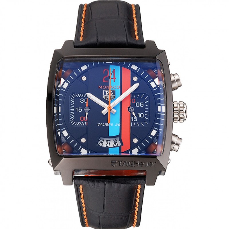 Tag Heuer Monaco Calibre 36 azul y naranja rayas Dial correa de cuero Negro 622302