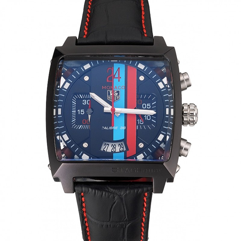 Barato Tag Heuer Monaco Calibre 36 azul y rojo rayas Dial Dial correa de cuero Negro 622272