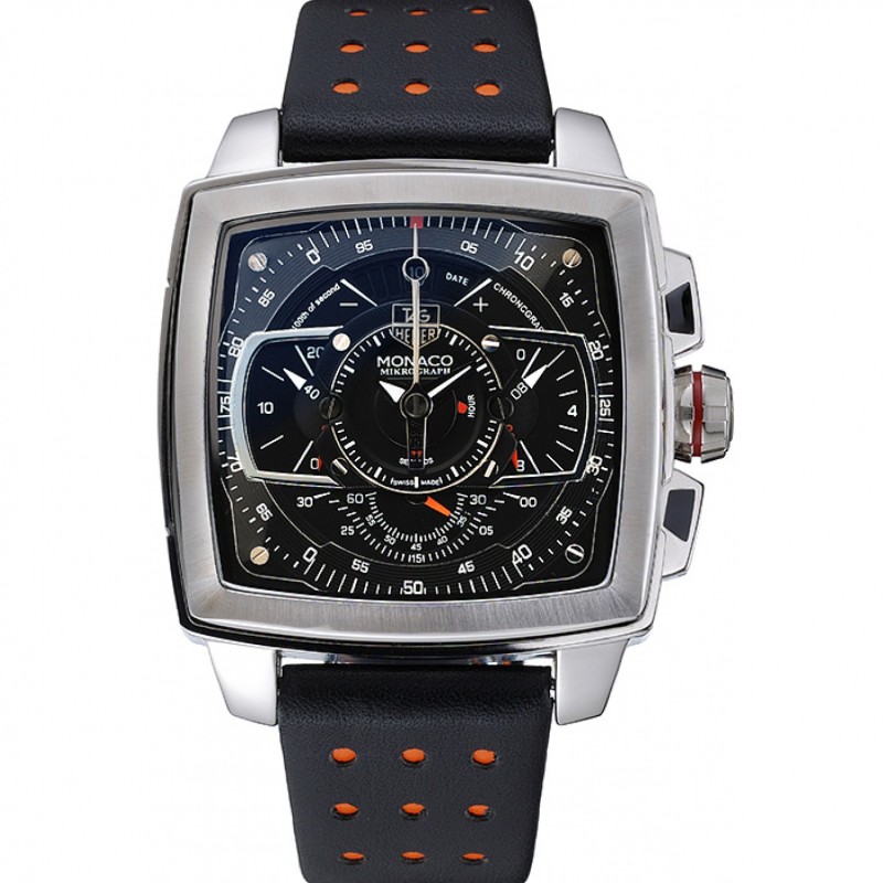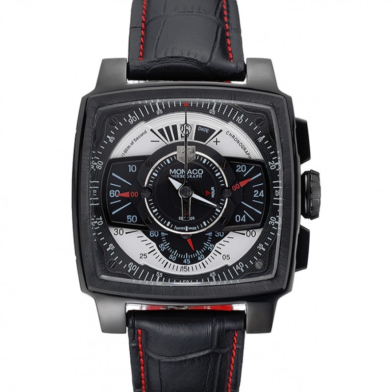 Alta calidad Réplicas Relojes Tag Heuer Monaco Negro-Rojo de cuero perforado Correa Negro Dial 80309