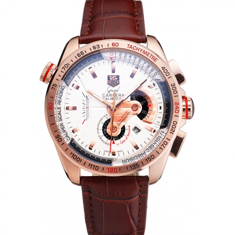 Alta calidad Tag Heuer Carrera Calibre suizo 5 Blanco Dial correa de cuero de oro rosa caja Brown