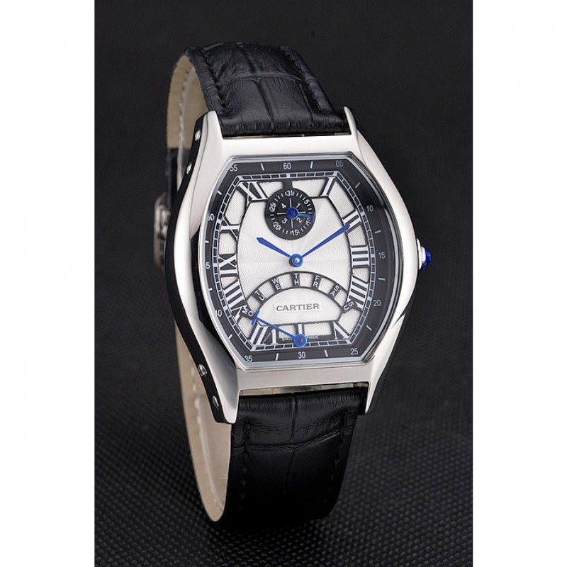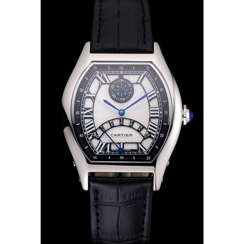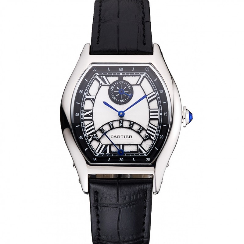 El «Cartier Tortue Calendario Perpetuo esfera blanca con correa de cuero negro y caja de acero inoxidable» es una pieza que une la tradición relojera con un diseño sofisticado y atemporal. Este reloj para hombres está equipado con un movimiento de cuarzo japonés Miyota, reconocido por su precisión y durabilidad. La caja de acero inoxidable pulido, junto con el bisel también pulido y la corona con espárrago de zafiro azul, destacan detalles que reflejan la calidad y el lujo característicos de Cartier. La correa de cuero de cocodrilo negro, con cierre plegable de hebilla en acero inoxidable, ofrece comodidad y un ajuste seguro para la muñeca. La combinación de la esfera blanca con el color negro de la correa genera un contraste elegante que es perfecto para quienes aprecian la estética clásica.