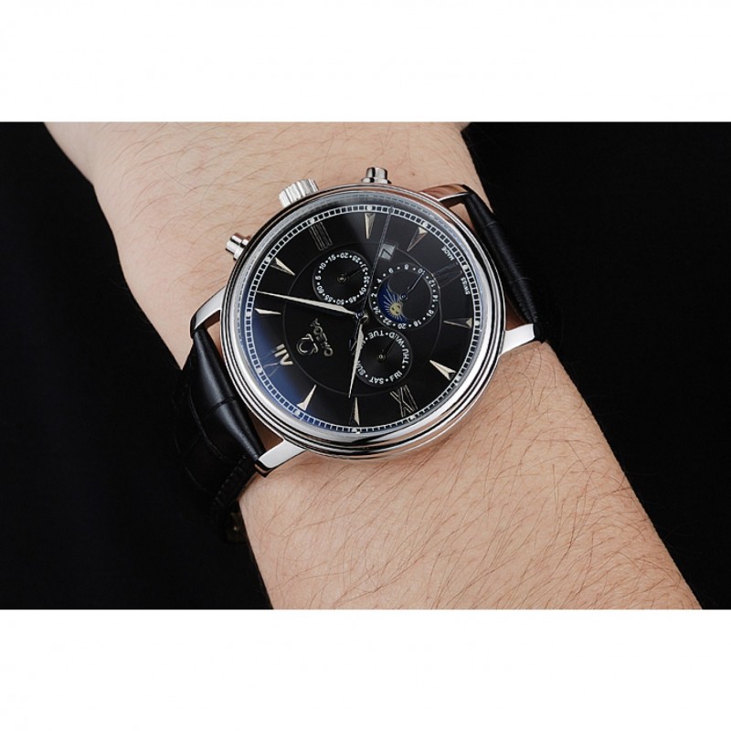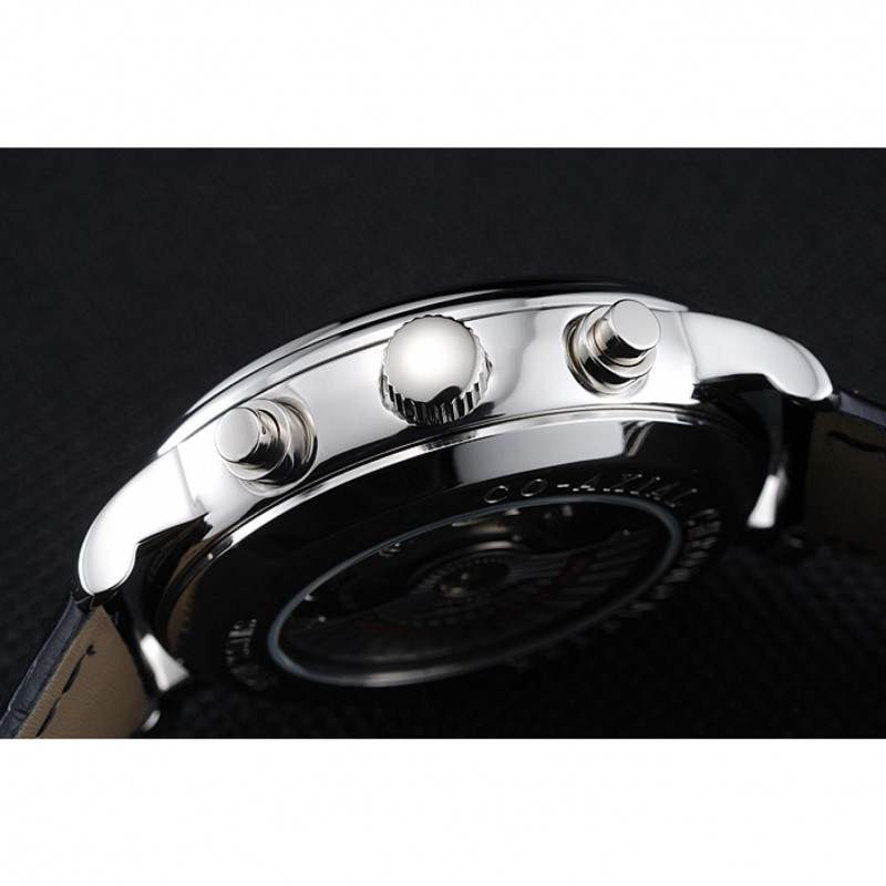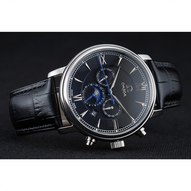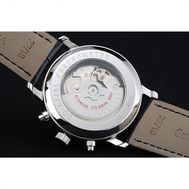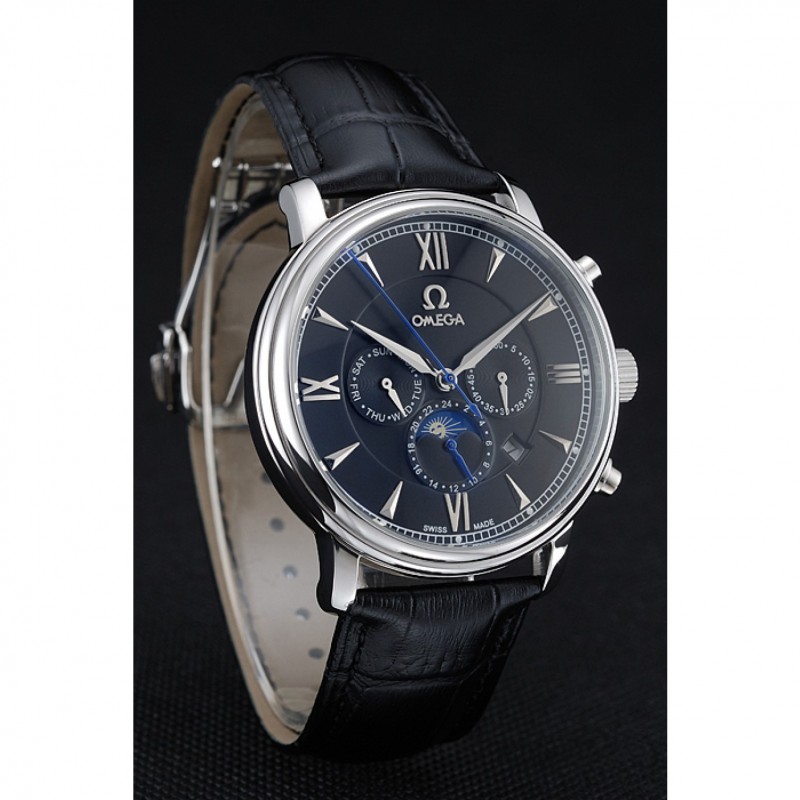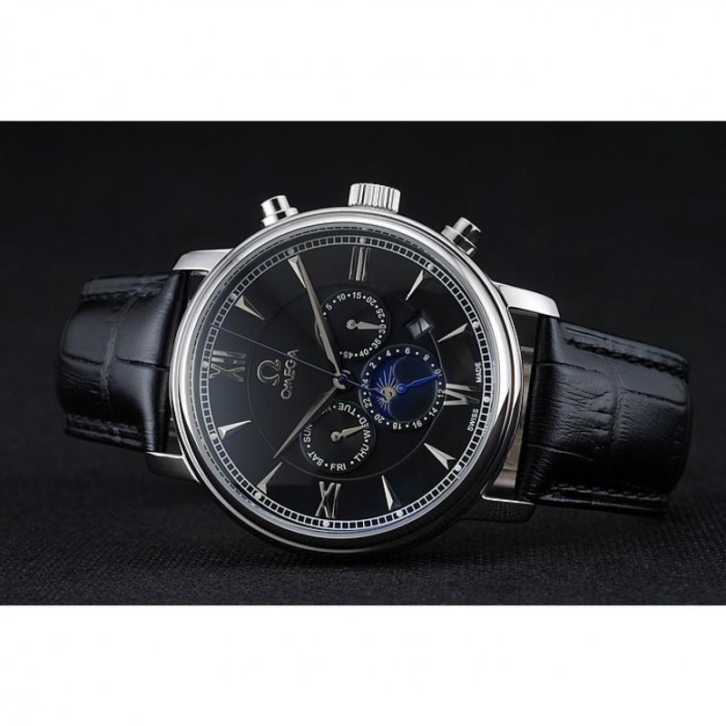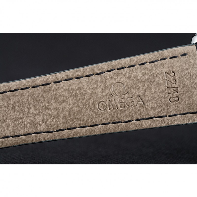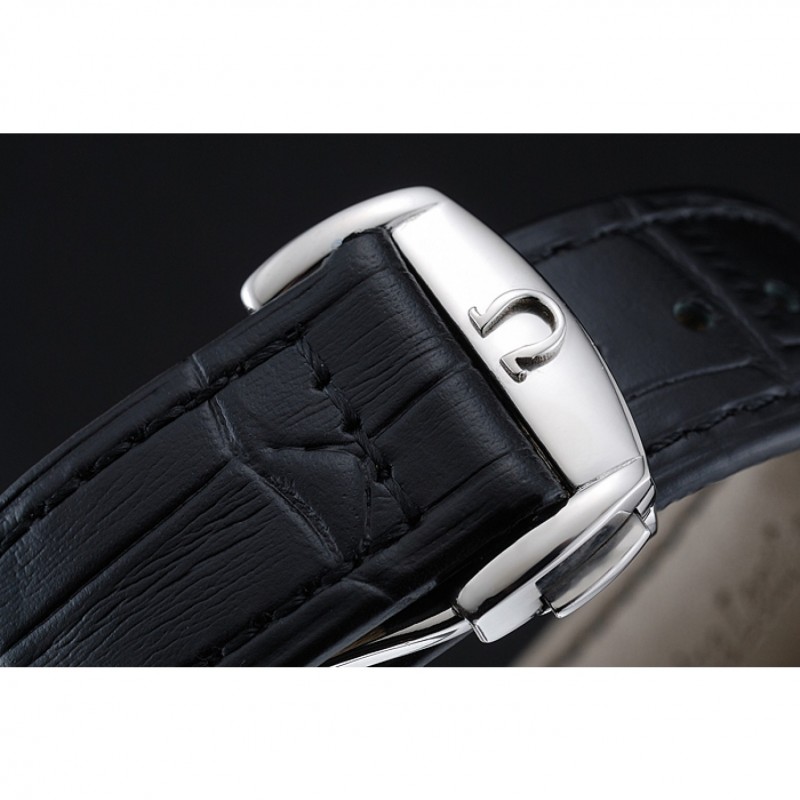 pulsera: correa de piel de cocodrilo negro Omega y el logotipo en relieve de calor con el logotipo de Omega grabado de acero inoxidable pulido hebilla de apertura de empuje del corchete