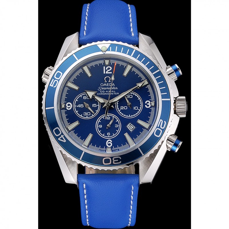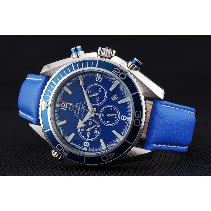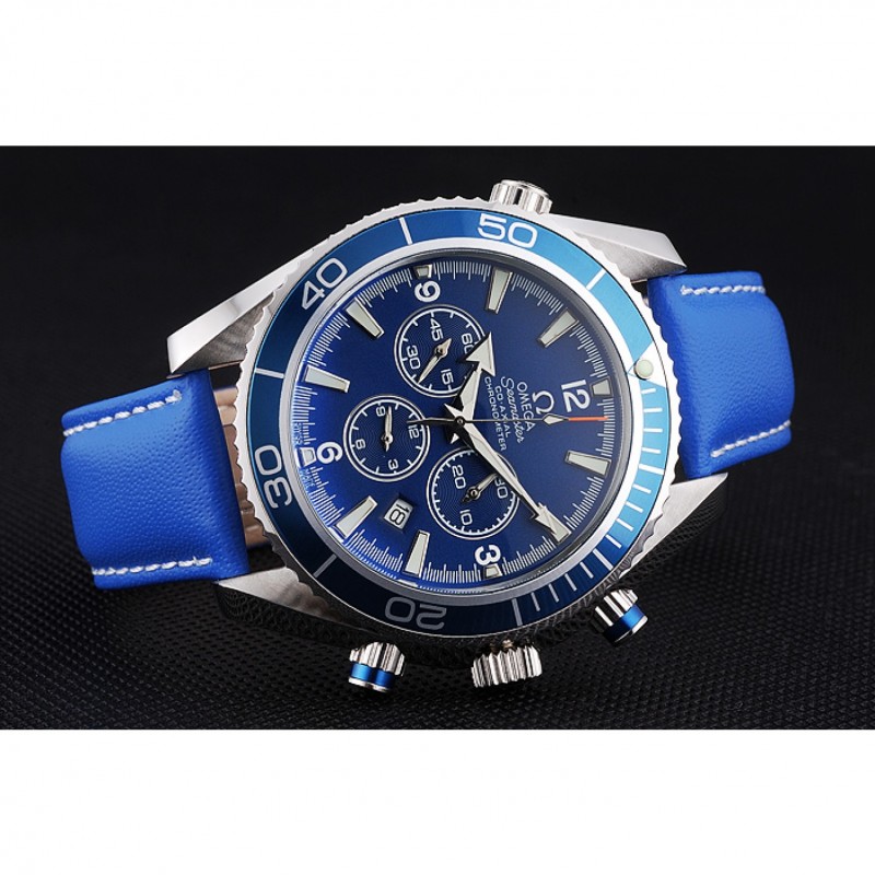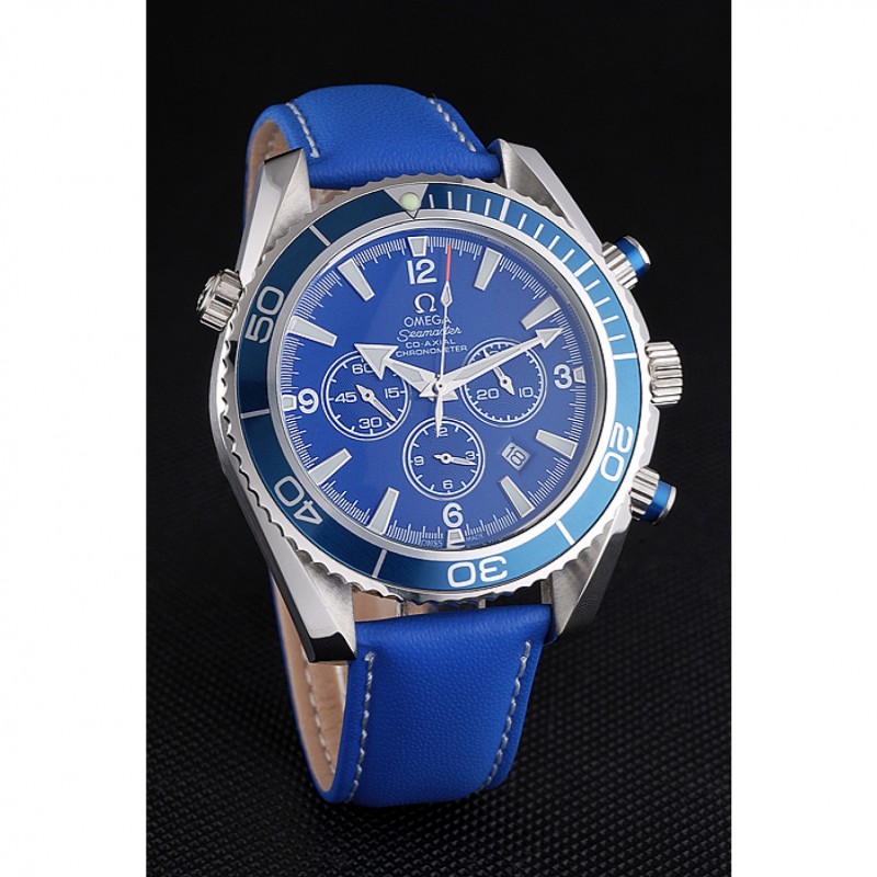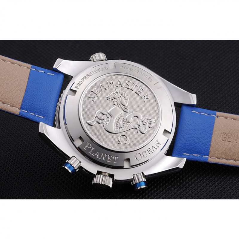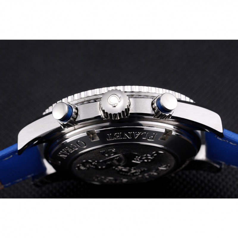 corona: Omega logotipo grabado pulido corona calado de acero inoxidable con un pulsador redondo de esmalte azul corona en ambos lados de ella, más una corona de calado en la esquina superior opuesta