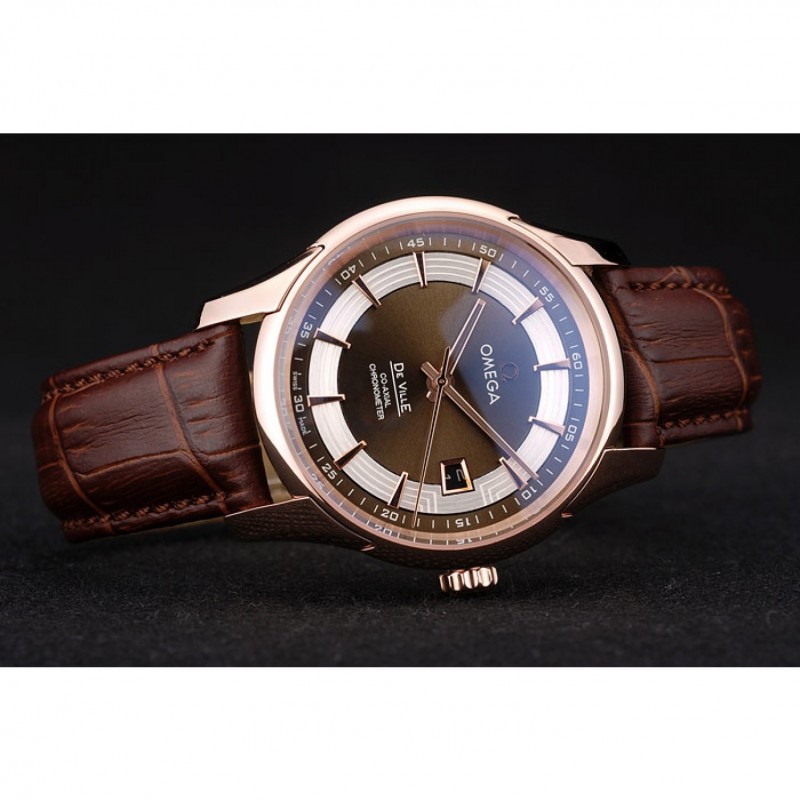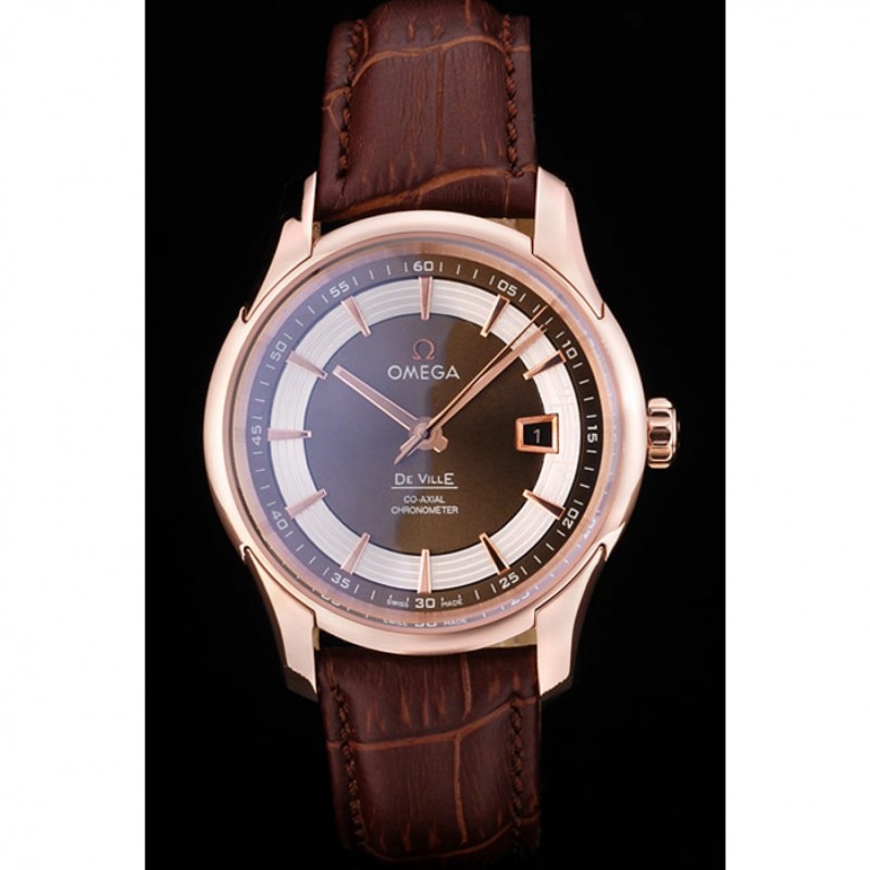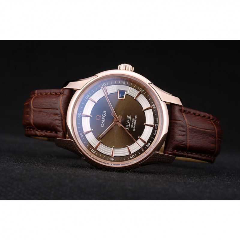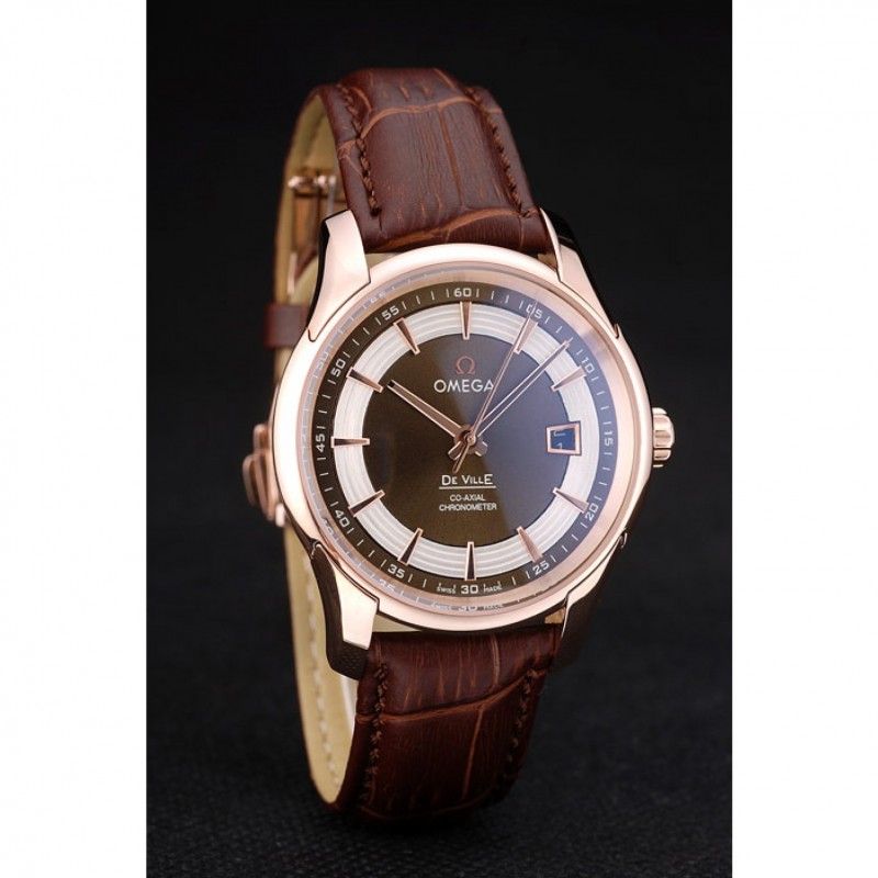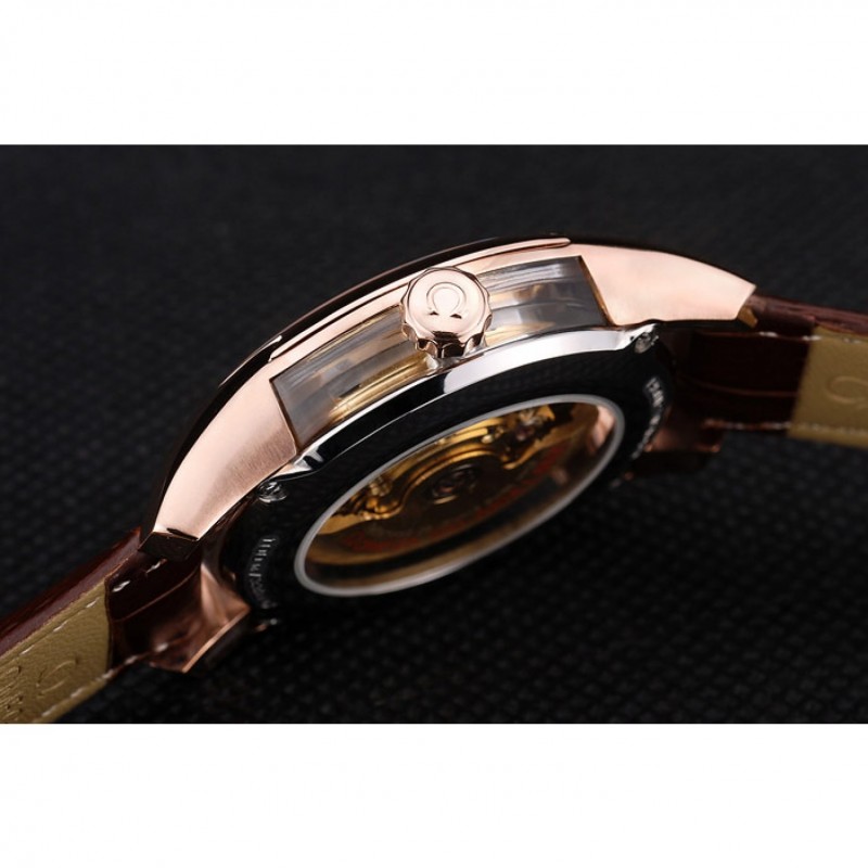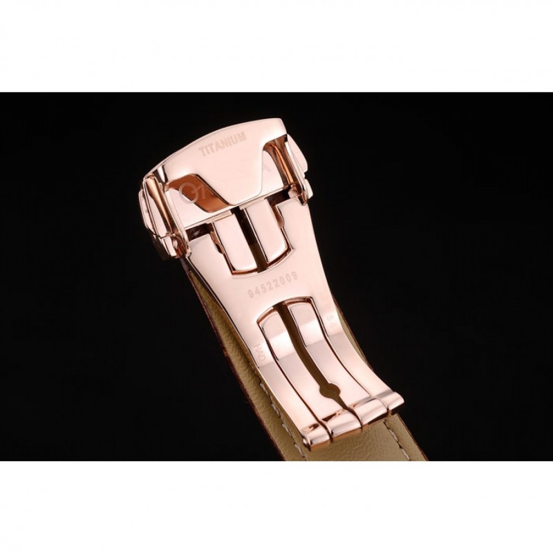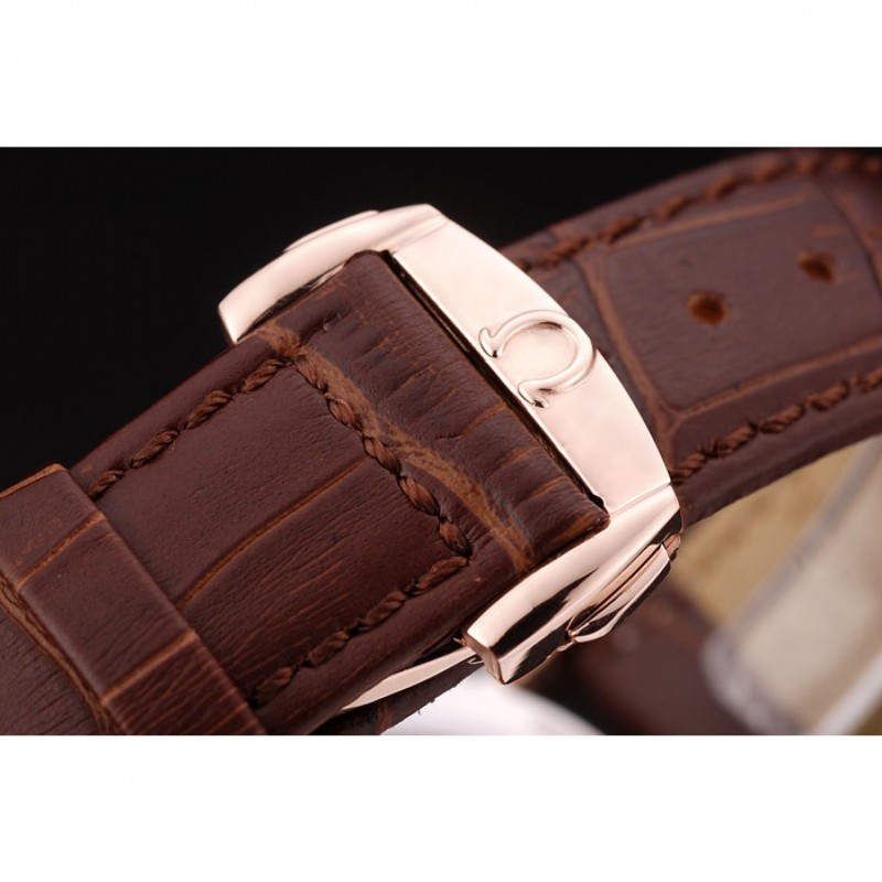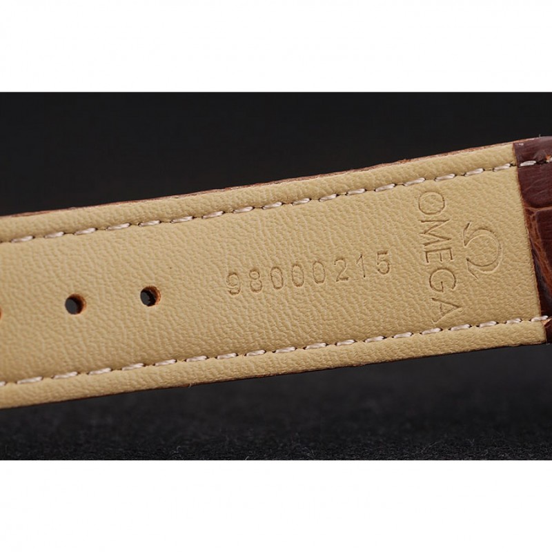 pulsera: Brown correa de piel de cocodrilo con relieve de calor Omega, el logotipo y código de producto y un grabado 18k logotipo de oro rosa plateado plegable en cierre de gancho