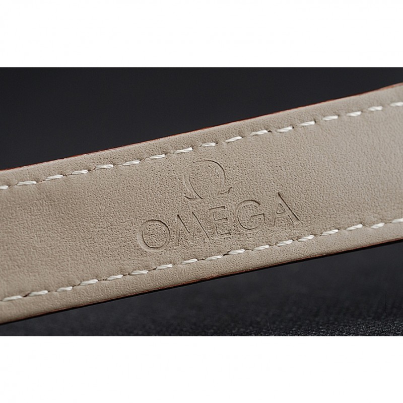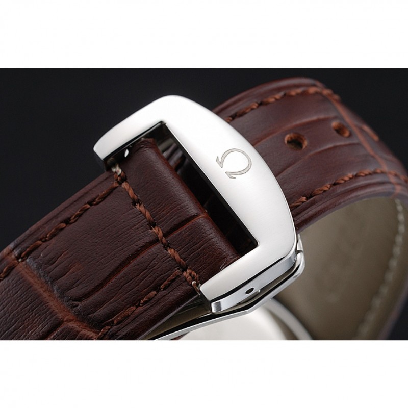 pulsera: de acero inoxidable correa de piel de cocodrilo marrón con costuras blancas y el logotipo de Omega grabado gancho hebilla de cierre