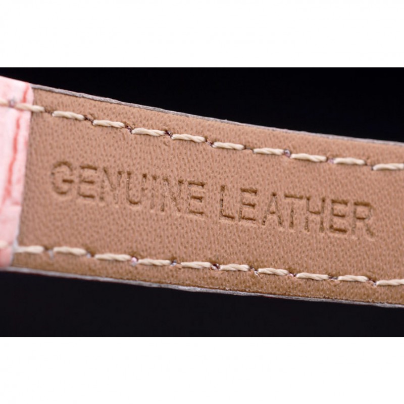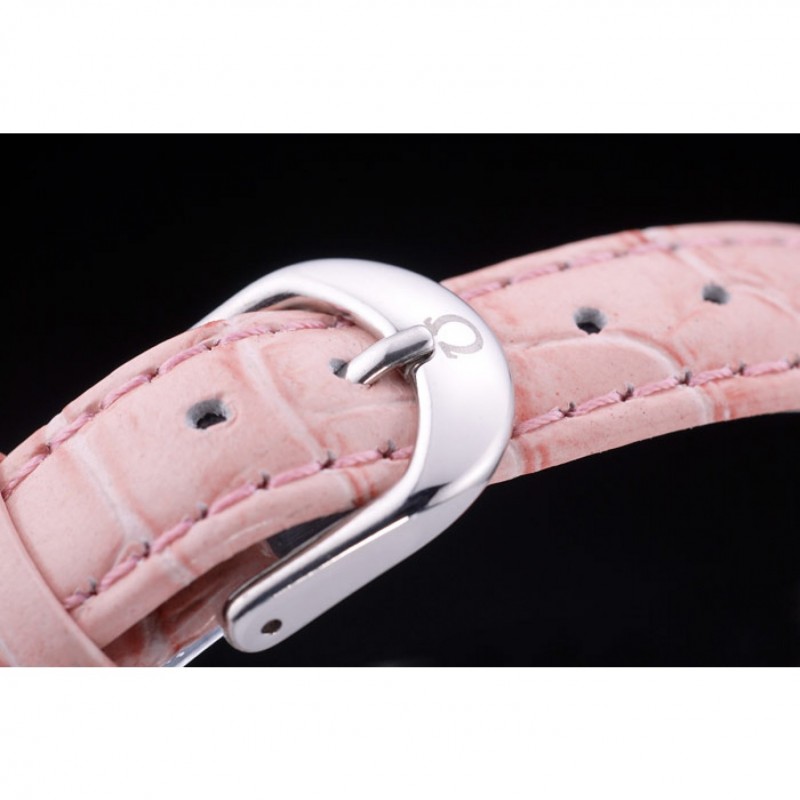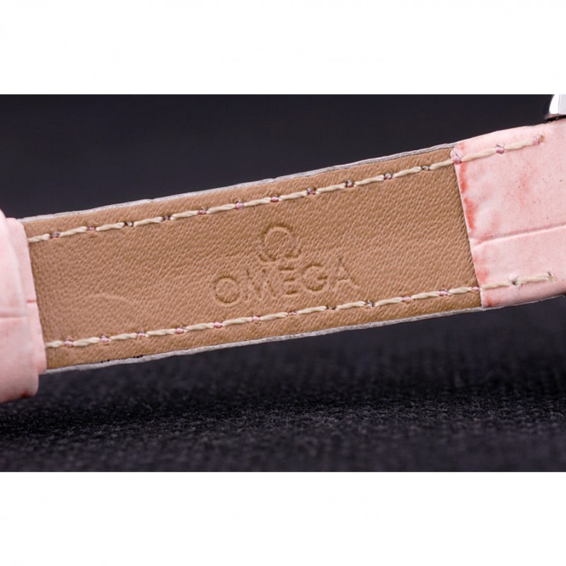 pulsera: correa de piel de cocodrilo de color rosa de calor Omega en relieve con Omega inscrito en acero inoxidable pulido gancho hebilla de cierre