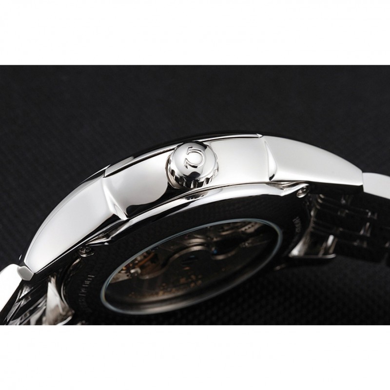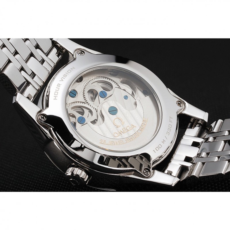 Volver: la mecánica transparente que revela centro inoxidable pulido acero atornillada de nuevo con Omega inscripción