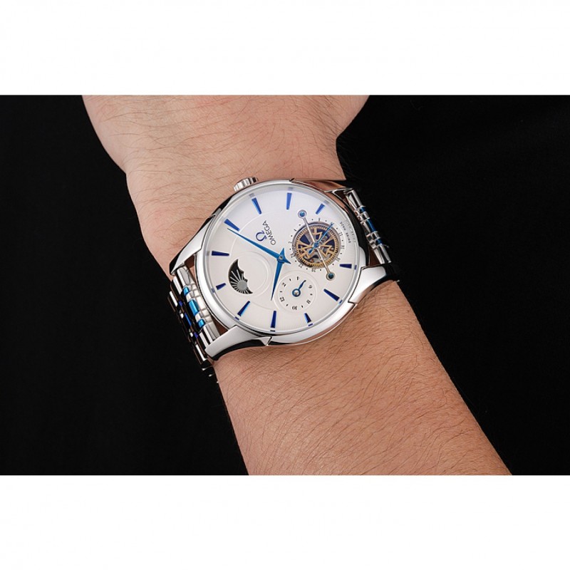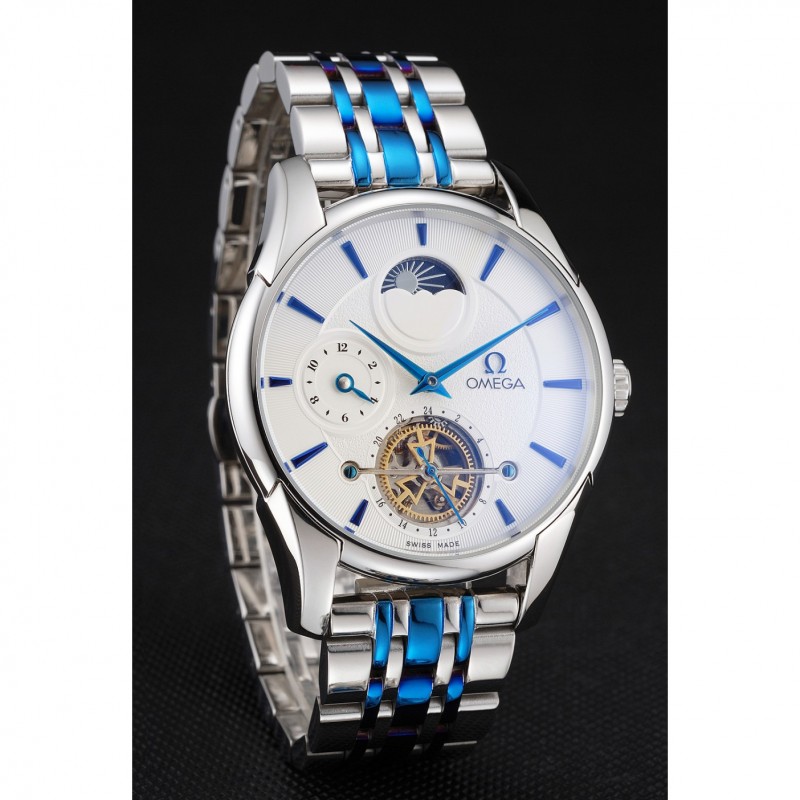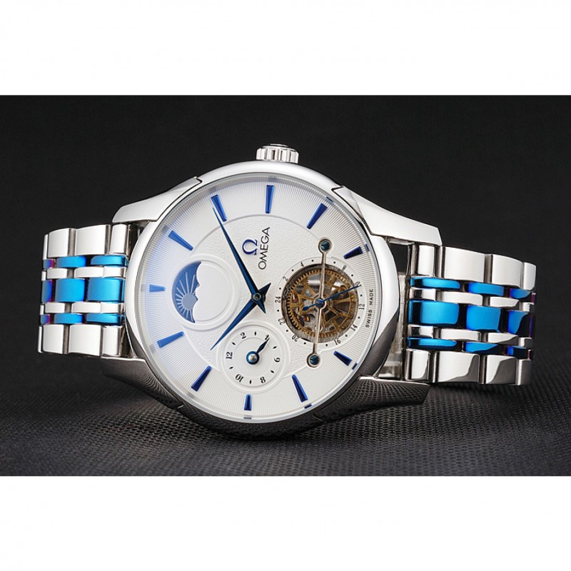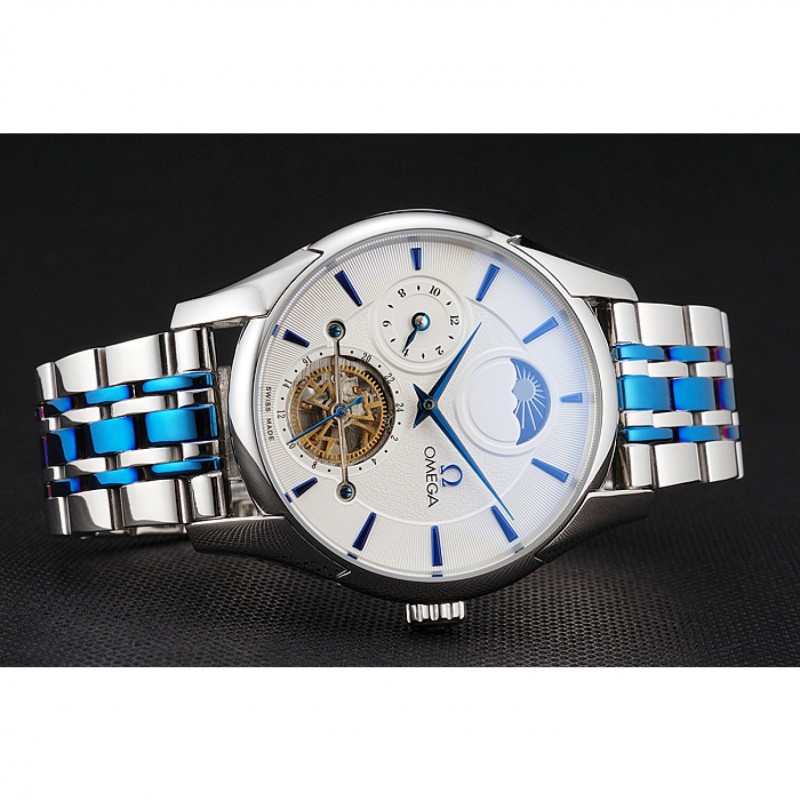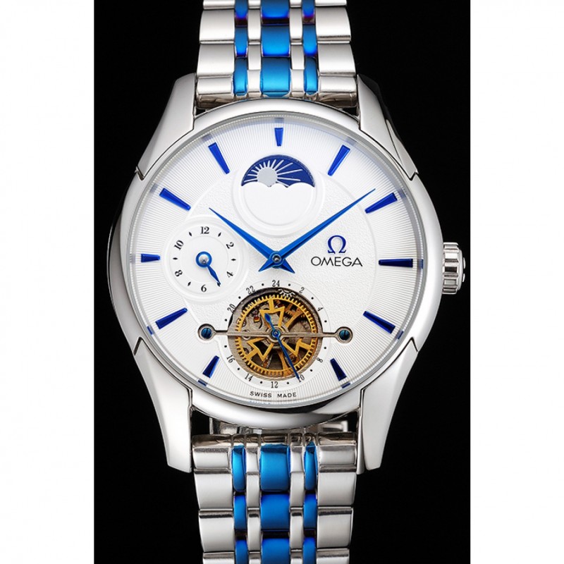 Omega De Ville Tourbillon Fase Lunar Blanco Dial Caja de acero inoxidable Dos pulsera de acero azul de tono