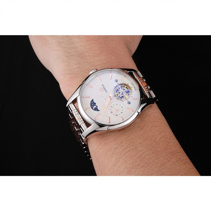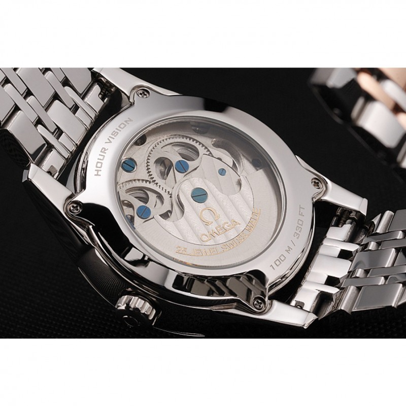 Volver: la mecánica transparente que revela centro inoxidable pulido acero atornillada de nuevo con Omega inscripción