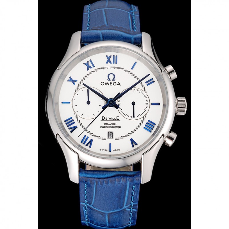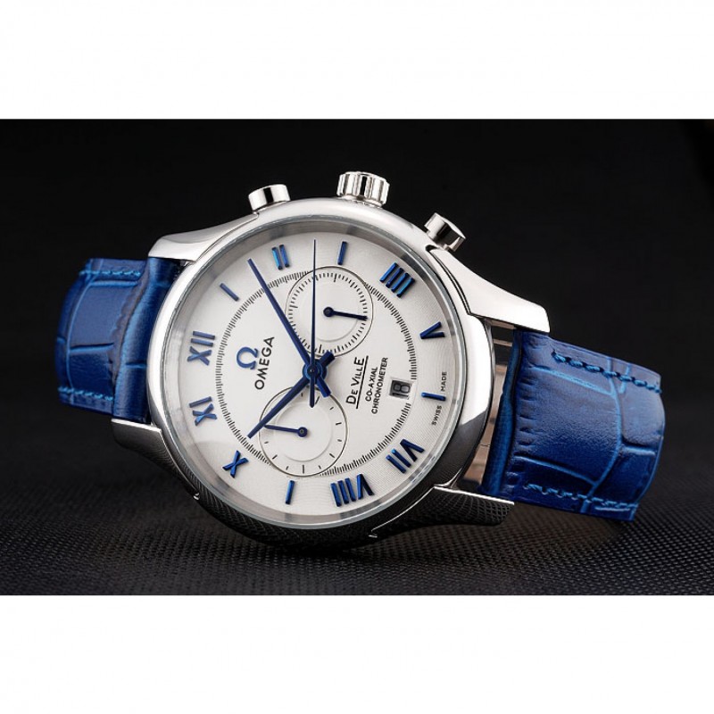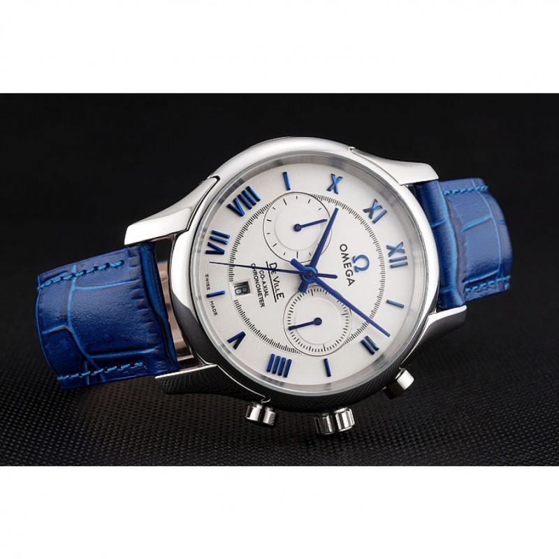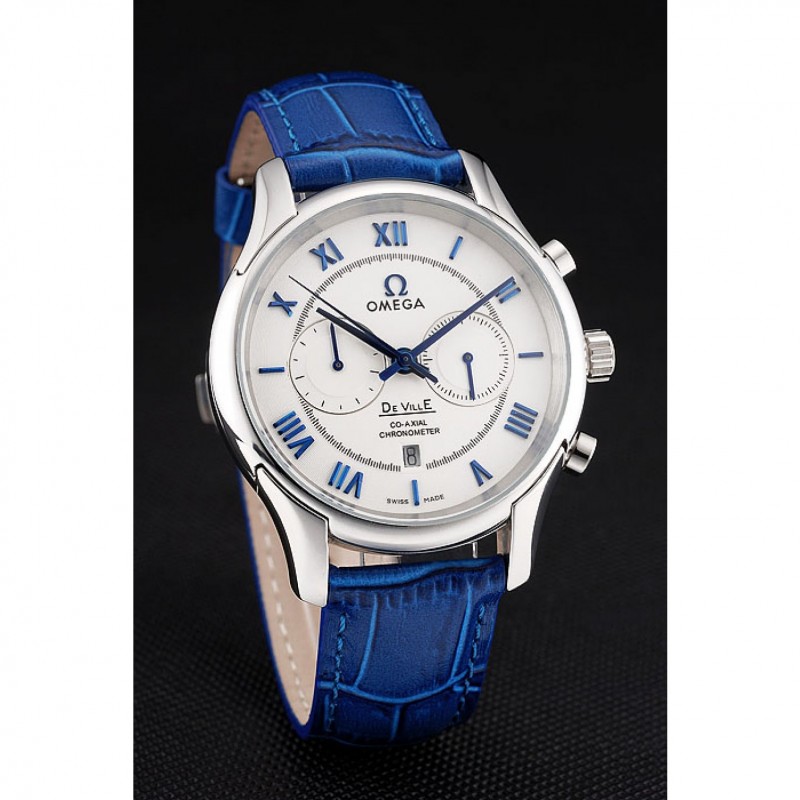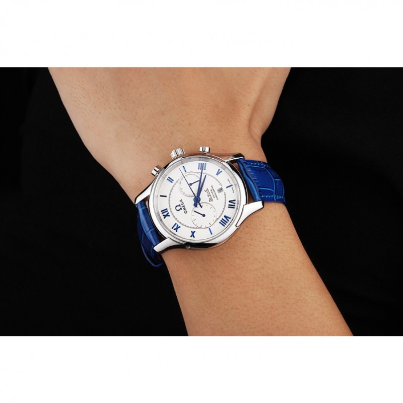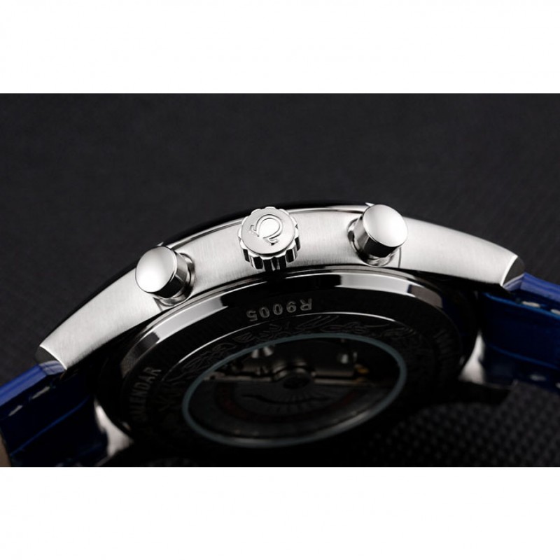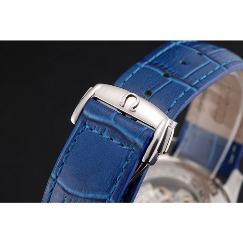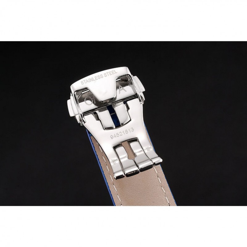 pulsera: Omega, el logotipo y código de producto de calor en relieve correa de piel de cocodrilo azul oscuro con el logo grabado de acero inoxidable pulido gancho de liberación empuje del corchete