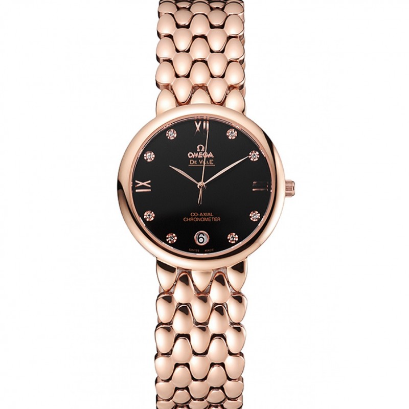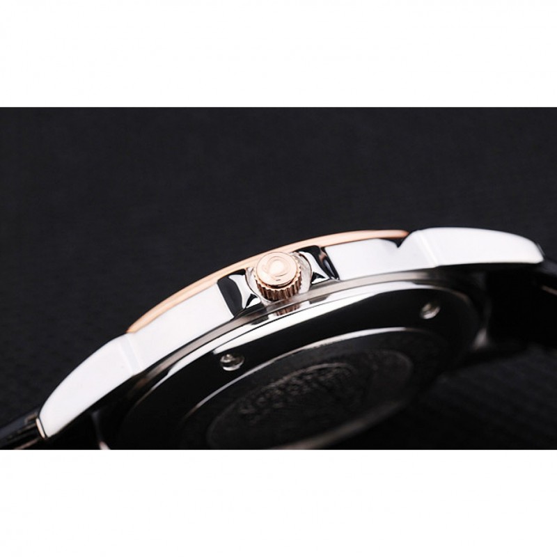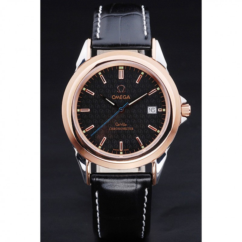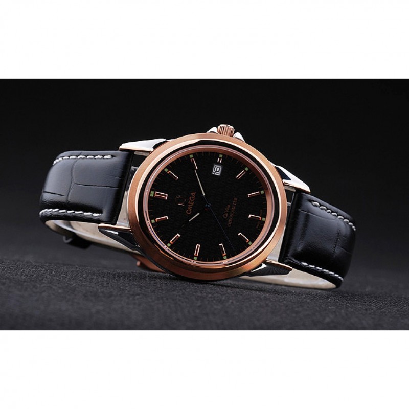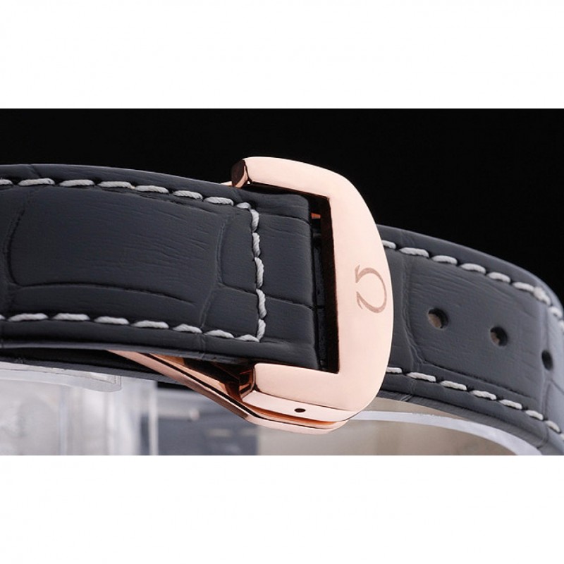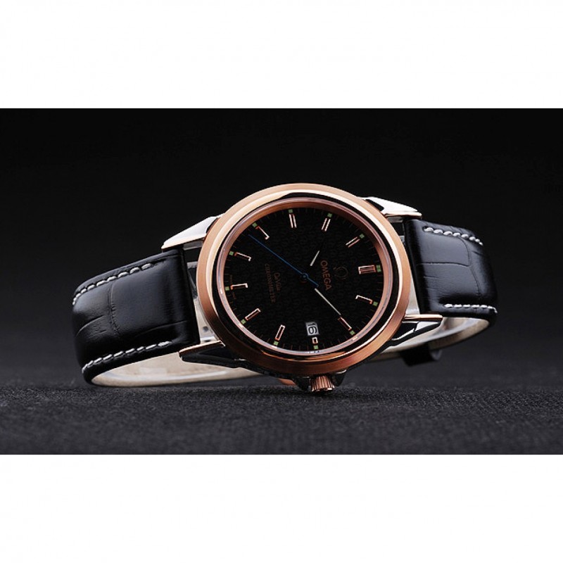 pulsera: correa de piel de cocodrilo negro con costuras de color blanco y el logotipo de Omega grabado gancho de oro amarillo corchete -buckle