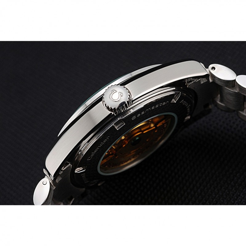 Volver: de acero inoxidable pulido snap-in de nuevo con la mecánica que revelan centro transparente y la inscripción Omega Seamaster