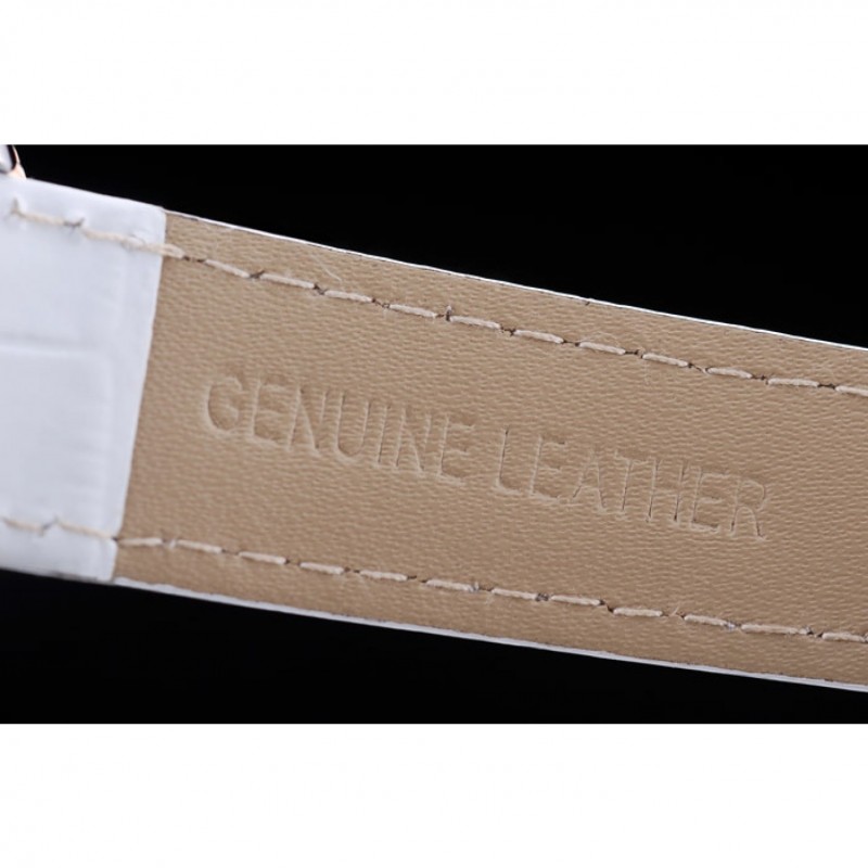 pulsera: correa de piel de cocodrilo de calor Omega en relieve charol blanco con Omega inscrito rosa de 18 quilates chapado en oro gancho hebilla de cierre