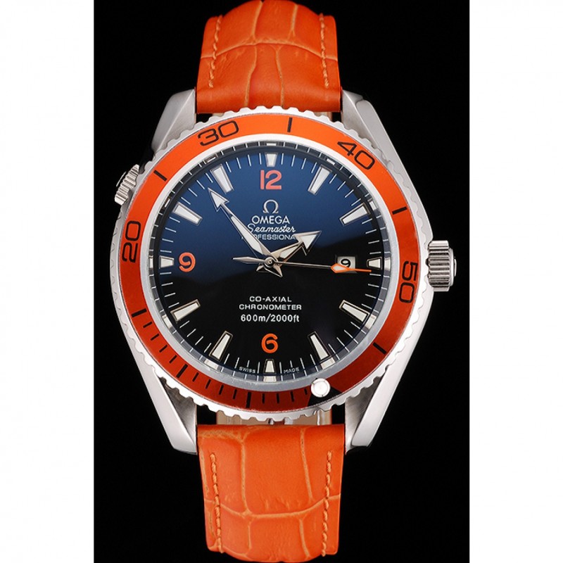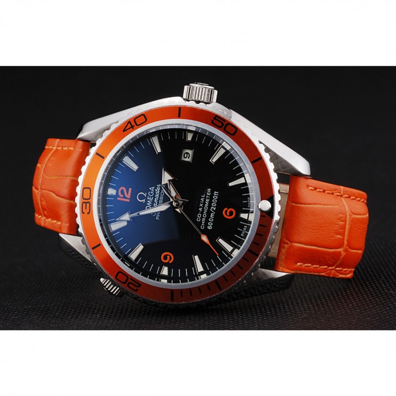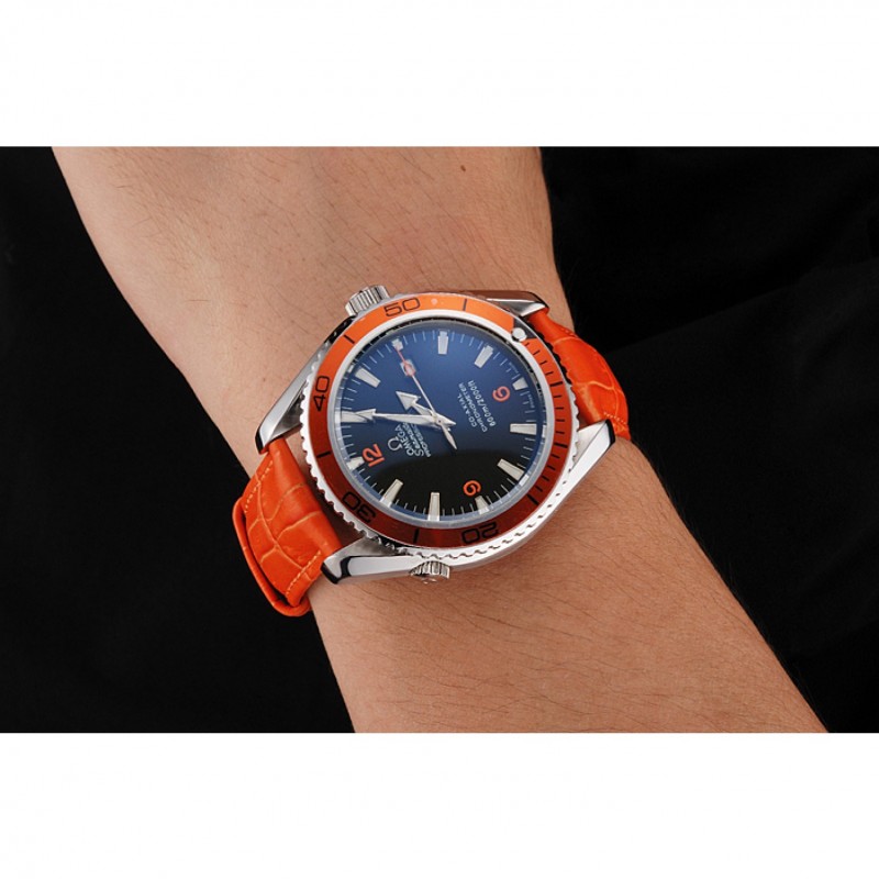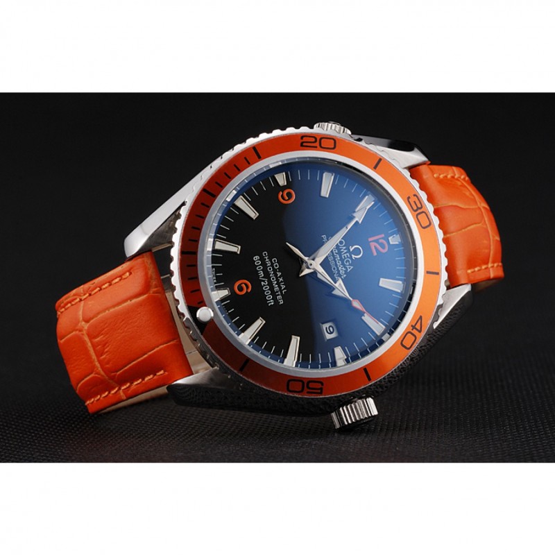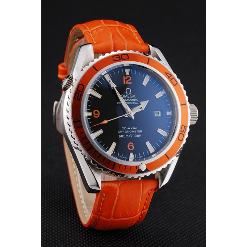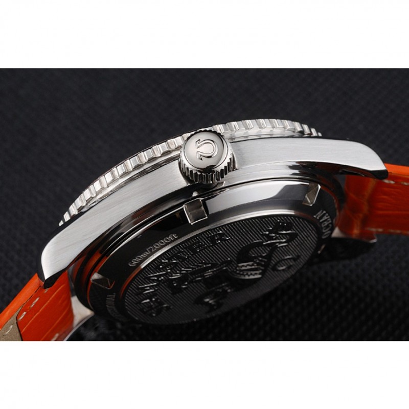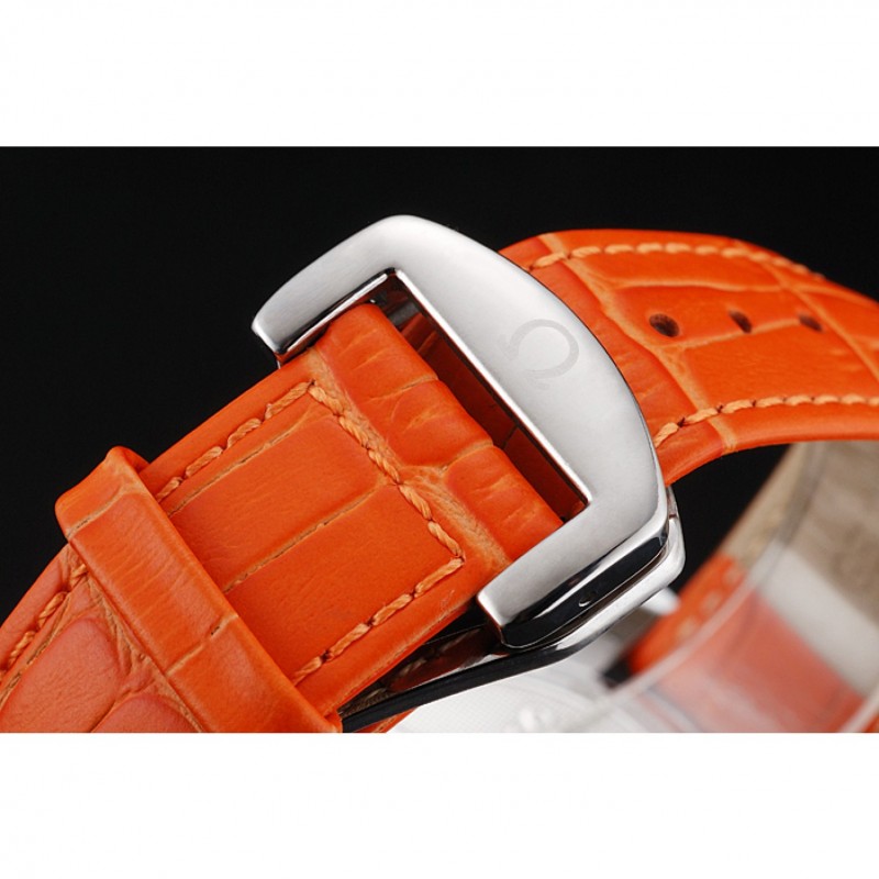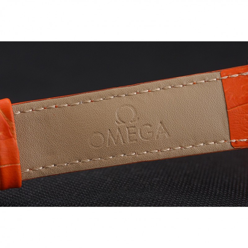 pulsera: Orange correa de piel de cocodrilo con calor en relieve sello de Omega y acero inoxidable cepillado gancho hebilla de cierre con el logotipo de Omega en la parte superior