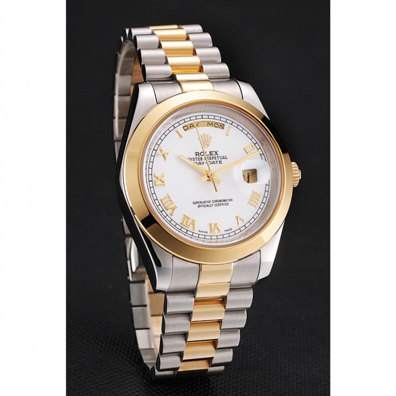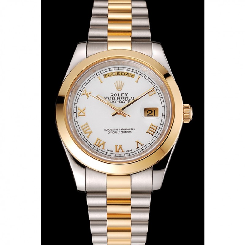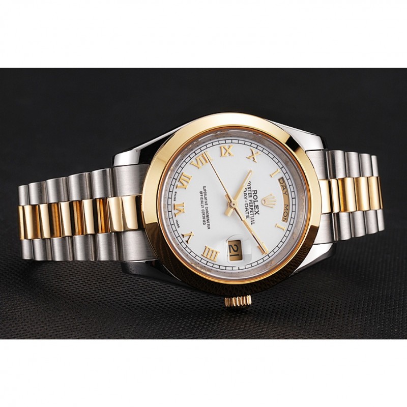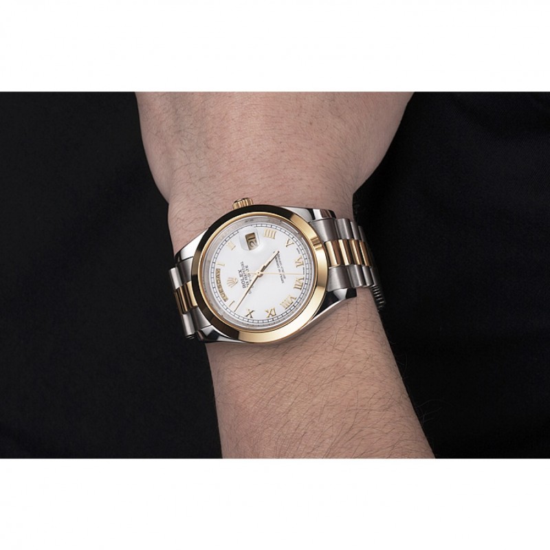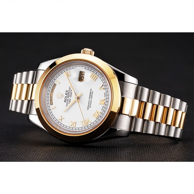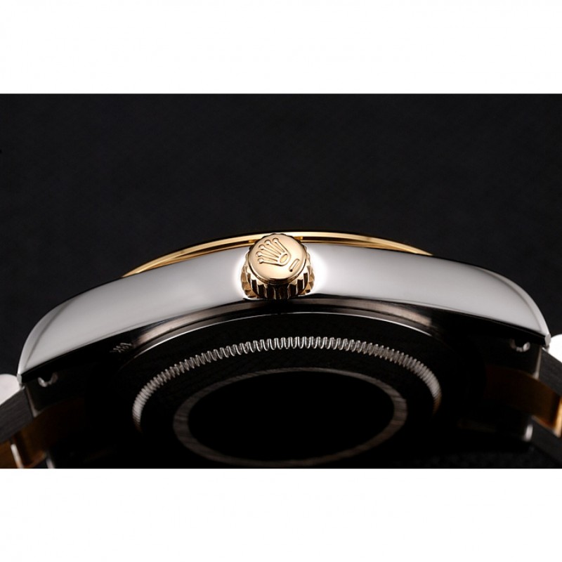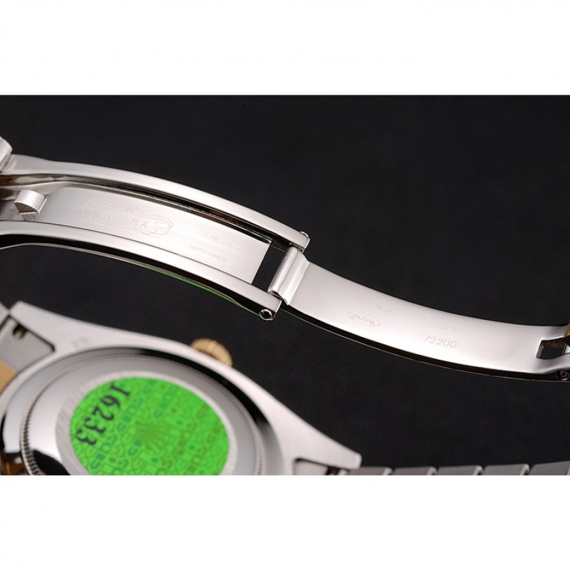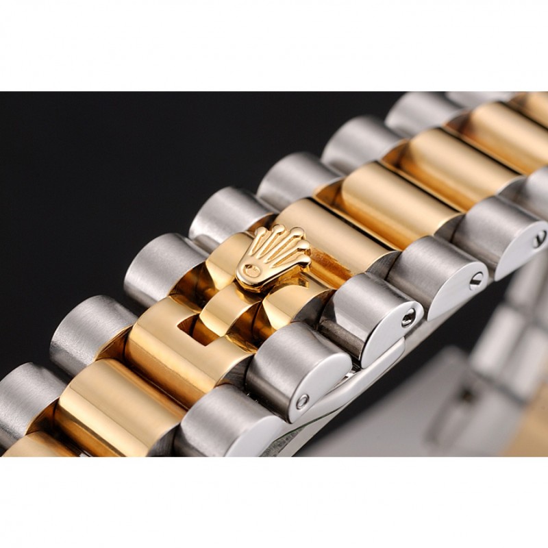 pulsera: cepillado de acero inoxidable y amarillo cadena de eslabones de oro con el doblez sobre el corchete y Rolex grabado de la corona