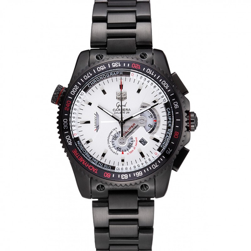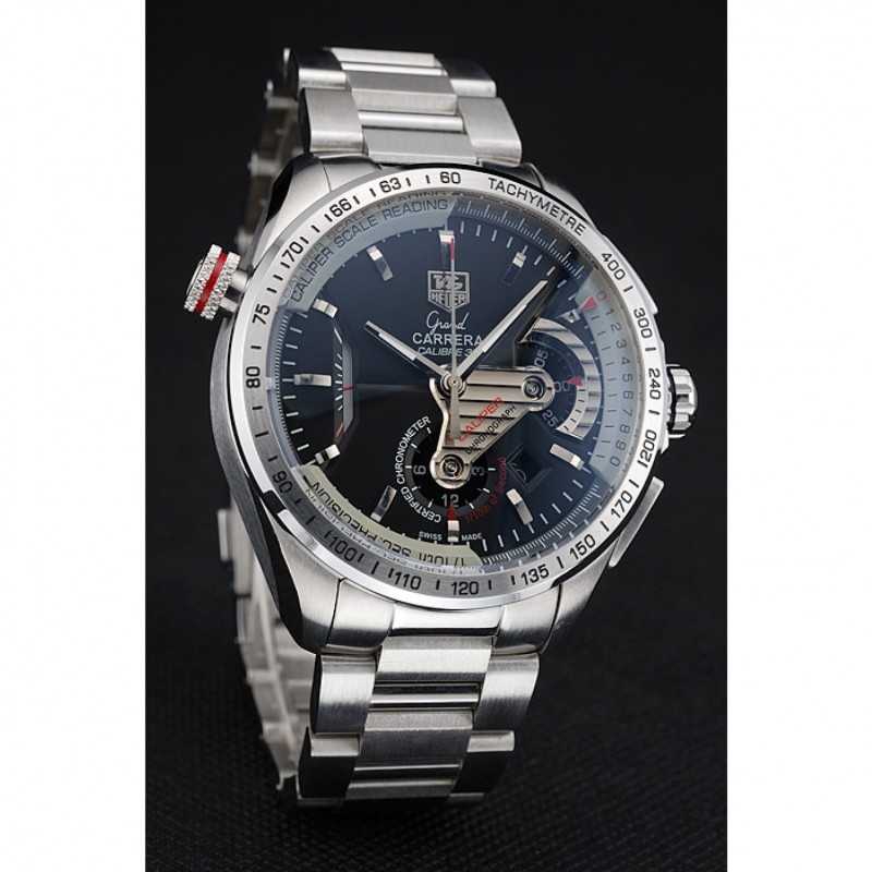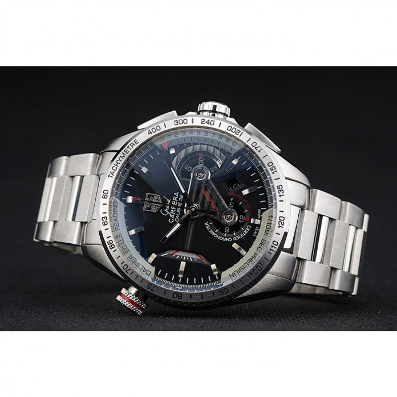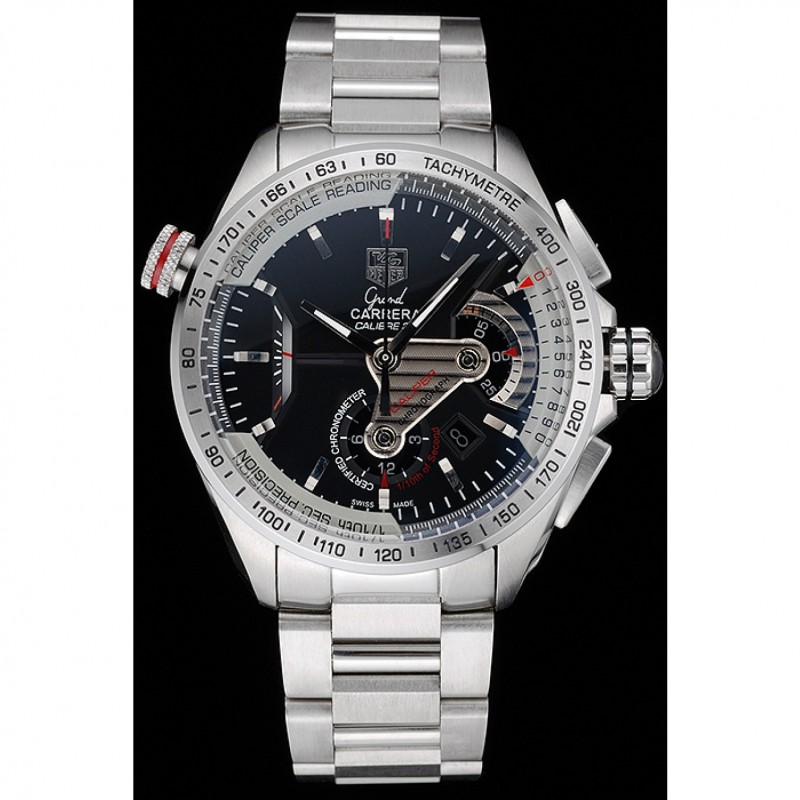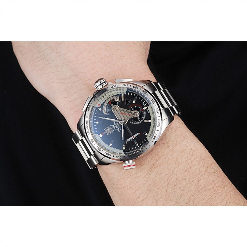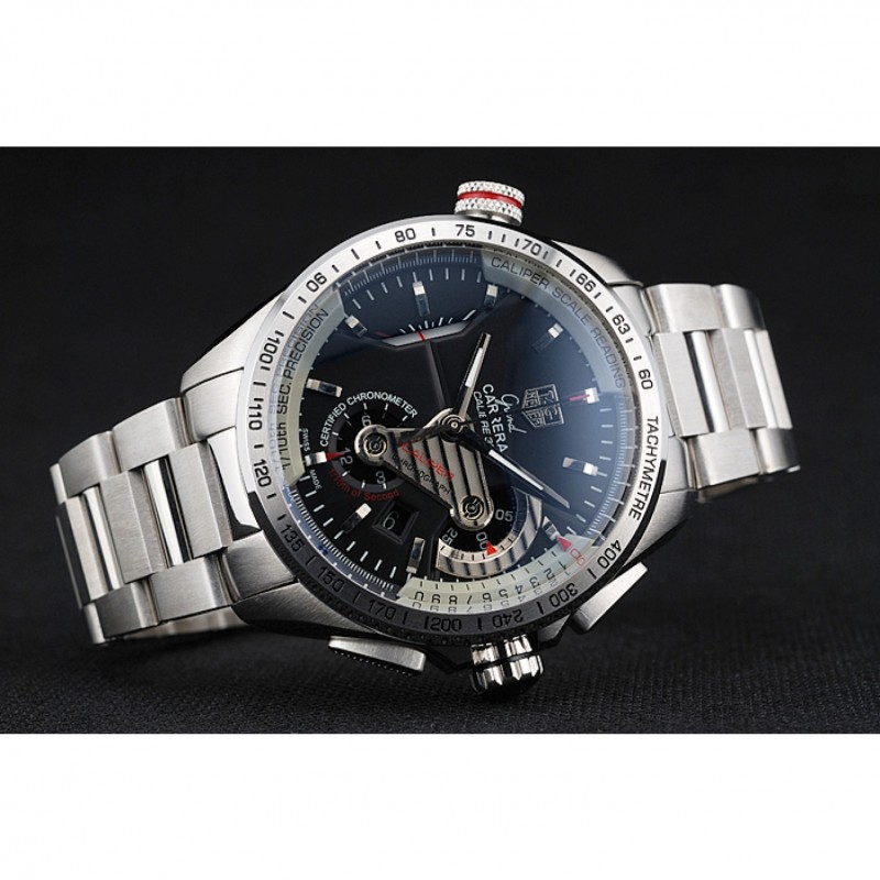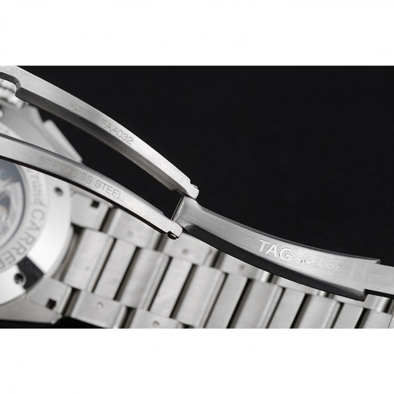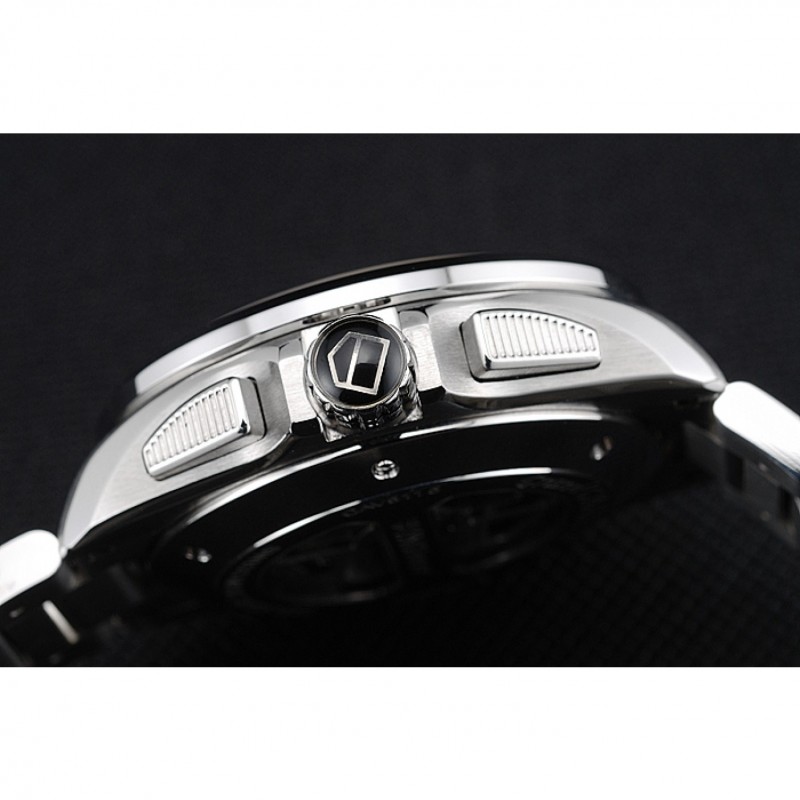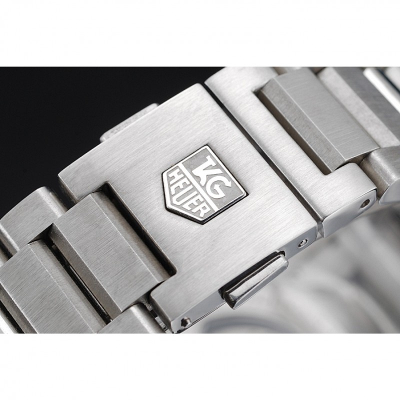 corona: pulido corona calado de acero inoxidable con negro esmalte logo TAG Heuer más dos coronas de pulsador rectangulares a cada lado y uno grande corona en la esquina superior opuesta con el logotipo
