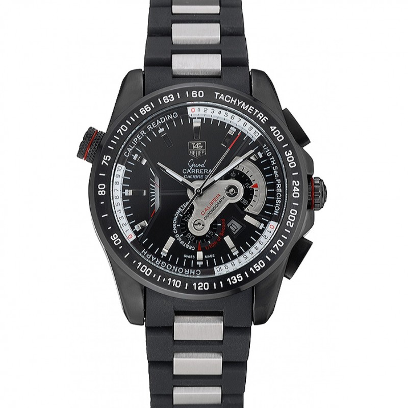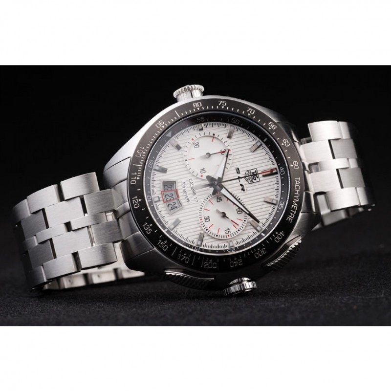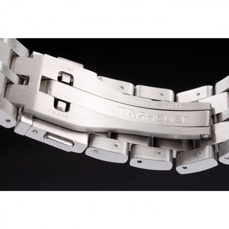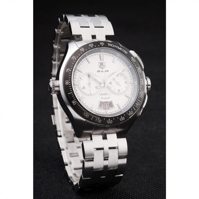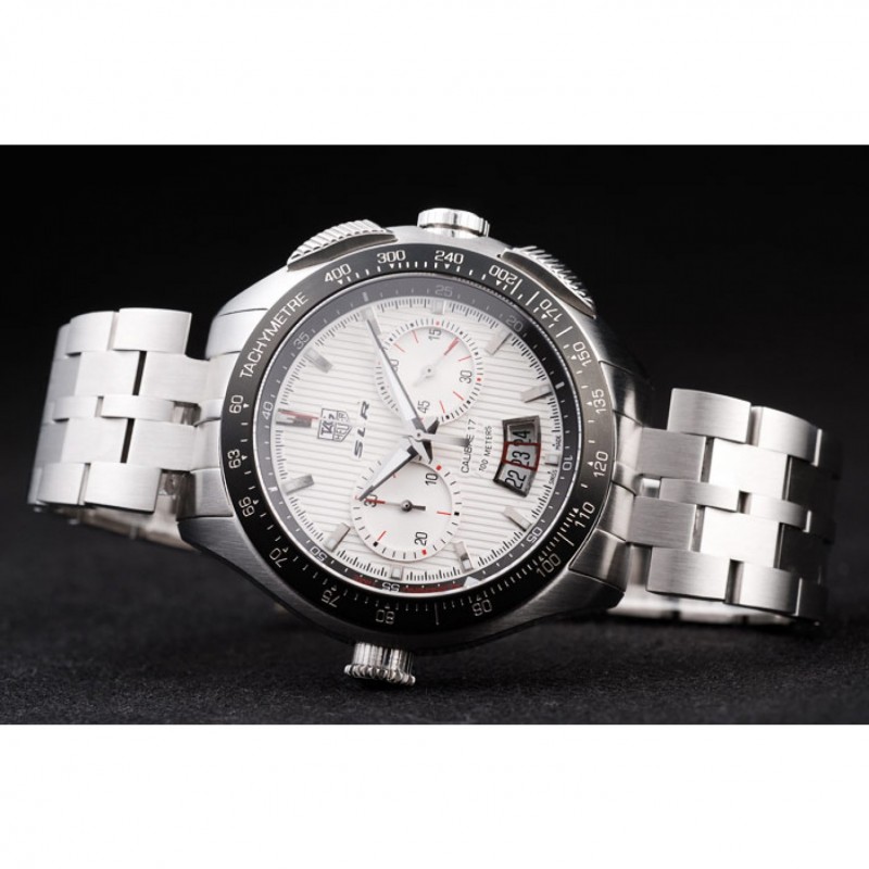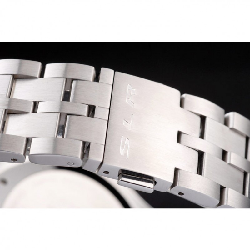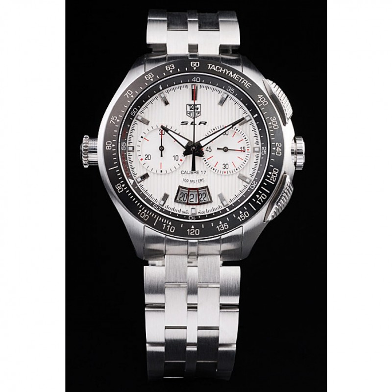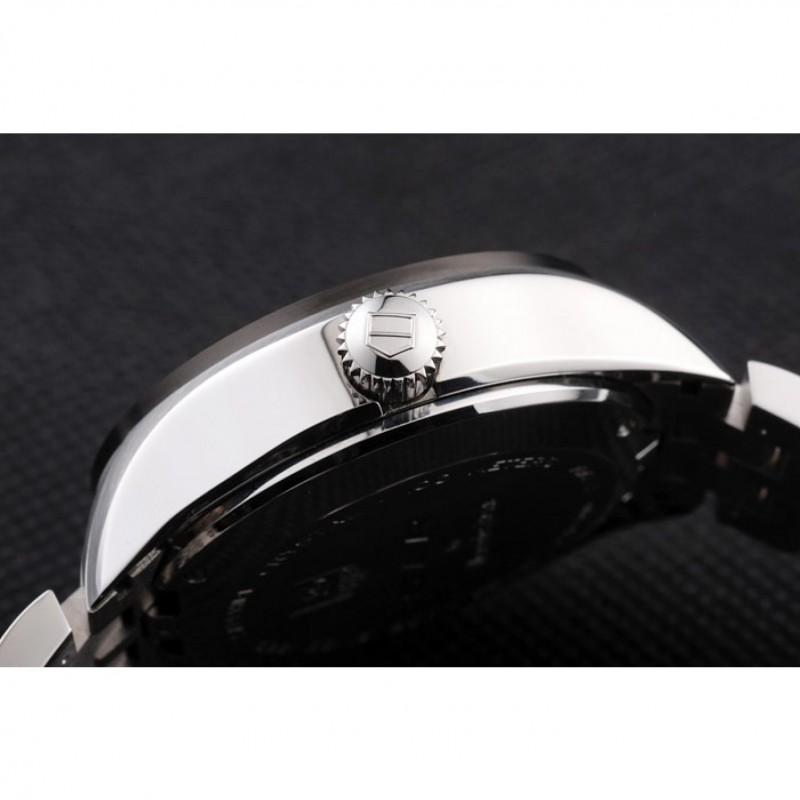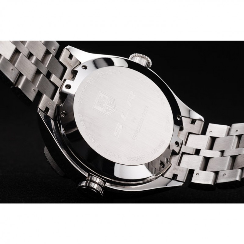 corona: pulido corona calado de acero inoxidable con SLR grabado más dos coronas de pulsador rectangulares a cada lado y uno grande corona calado en el lado opuesto con la etiqueta logotipo Heuer